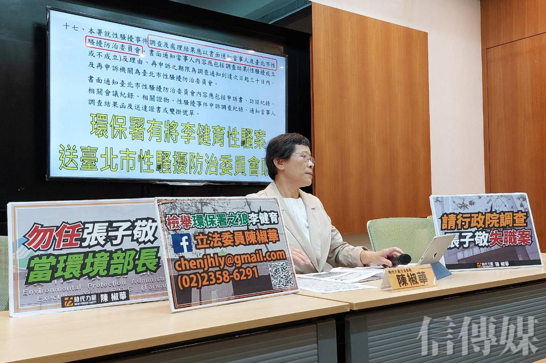 陳椒華補充,環保署應將性騷擾調查處理結果通知台北市性騷擾防治委員會,但由於吃案,北市性騷防治委員會可能從未收到相關書面報告,勞動部網站上也查不到環保署性騷案的紀錄。