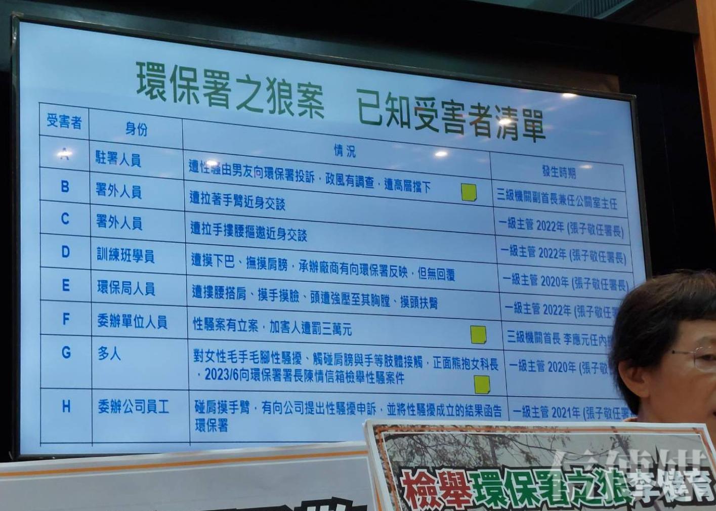 時代力量立委陳椒華今(26)天上午召開第四次記者會,正式公布環保署內部疑似性騷慣犯為現任環境督察總隊總隊長李健育,同時揭露新收到的指控資料,痛批現任環保署署長張子敬吃案無數,在張子敬的包庇之下,近年持續造成署內外多位女性受害,陳椒華表示已知內部檢舉至少有八案(如下圖)。