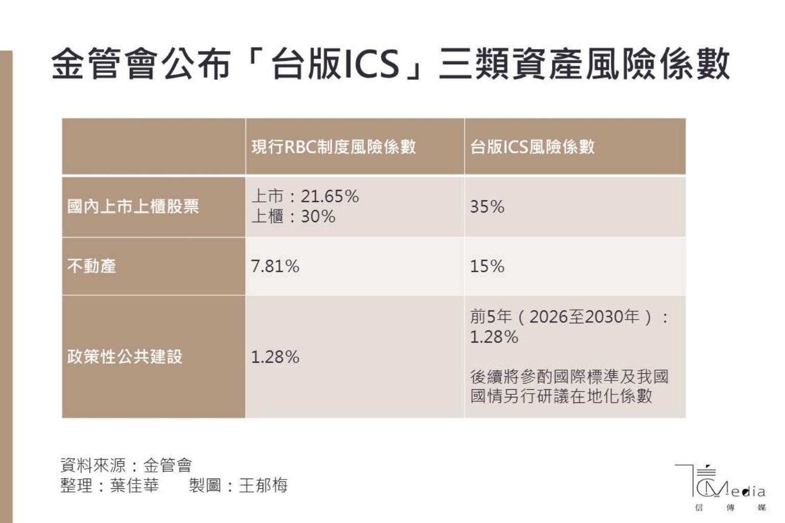 金管會在符合ICS的架構下,制定適合我國國情的在地化及過渡性措施TW-ICS(又稱台版ICS),其中,保險業投資國內上市櫃股票適用的風險係數由現行的21.65%,2026年接軌後得分15年達到風險係數35%,等於每年約增加0.89%;投資不動產適用的風險係數則由現行的7.81%,接軌後也要在15年內逐步達到風險係數15%的門檻。