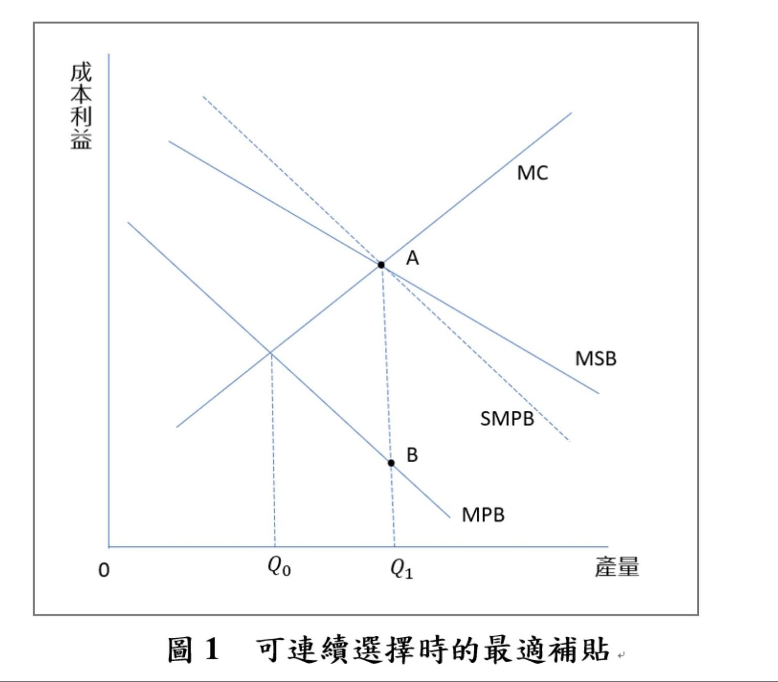 圖1是經濟學分析外部性問題時常用的方法。以某產品的生產為例來說明,假設MC是產品的私人邊際成本,也假設等於社會邊際成本,MPB和MSB分別是私人可得到及全社會能得到的邊際利益。如果政府沒補貼,私人為求私人利益極大,將生產到Q0 。但從Q0 再增加產量的話,因為MC仍低於MSB,所以社會的淨利益會增加。因此政府應該鼓勵增產到Q1 ,邊際成本才會等於邊際社會利益而不值得再增產。