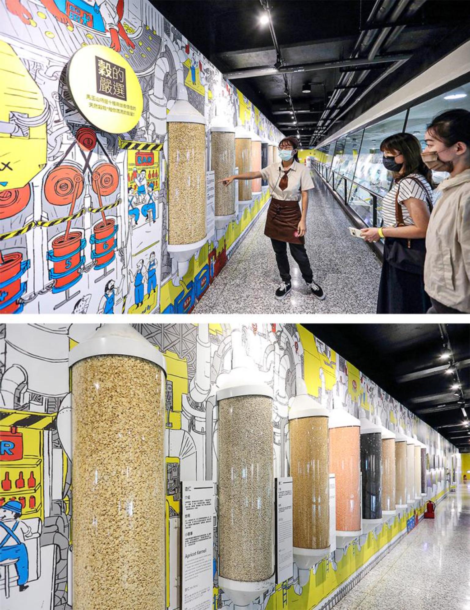 穀物之旅從5樓的「馬玉山故事館」出發,一踏出電梯即可透過環形玻璃空橋觀看隨身包的產線和包裝流程,穿越穀豆與十二生肖結合的星空隧道,高雄在地藝術家Croter發揮創意,將穀物文化和品牌歷史畫成童趣繽紛的插畫;穀物知識區介紹數種常見穀物,讓大、小朋友一起觀察穀物外觀,認識其妙用和小趣事。