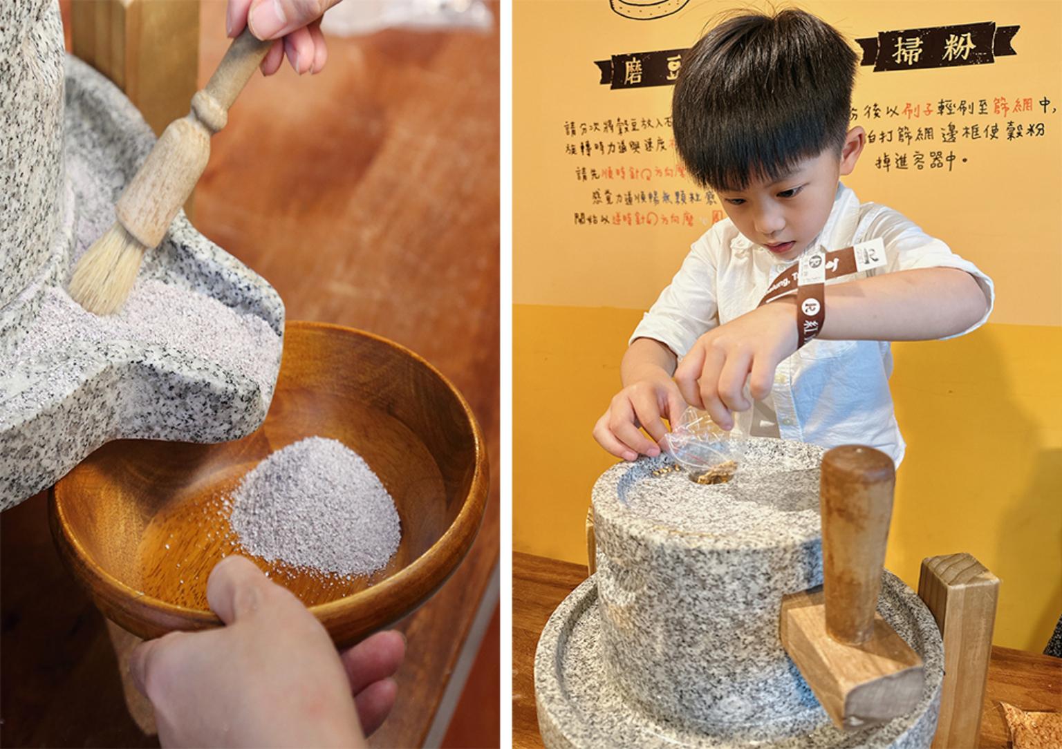 最後一站來到孩子們最期待的「磨榖樂DIY」,可體驗穀物飲品製作流程,透過觀察、觸摸、轉動石臼,聽見穀豆被研磨的聲音、聞到磨成粉末的穀物香等步驟,體驗過程將穀物樂園深深地烙印在記憶中。玩了大半天後稍感疲累,在一樓的穀倉咖啡則提供各項飲品餐點,在英式穀倉氛圍中補充體力,為旅程劃下美味句點。