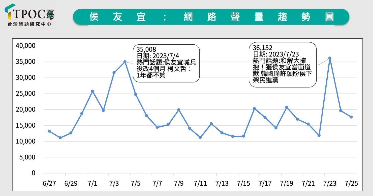 《信傳媒》記者向TPOC台灣議題研究中心索取最新輿情數據,發現侯友宜的網路聲勢在金溥聰入陣後,只出現2個聲量高峰。第一次是拋出兵役縮短為4個月政策,但這次顯然是負面聲量居多,連金都要親自上陣滅火;另一次則是全代會「漢子、禿子、燕子」大合體,但一般認為,此與黨中央的積極籌辦有關。TPOC台灣議題研究中心指出,整體而言,金加入團隊之後,明顯未讓侯的聲勢有所提升。