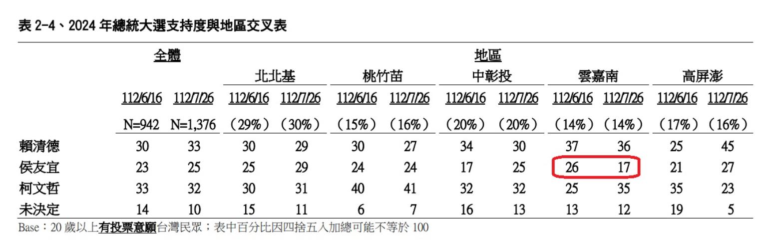從《TVBS》最新民調數據來看,金溥聰走訪雲林之後,包括侯友宜故鄉嘉義本命區在內,侯在雲嘉南的支持度反而大幅滑落,從6月還有26%支持度,7月全代會後反而只剩17%,跌幅高達9%。好消息是,在台中市長盧秀燕多次加持之下,侯在中彰投則有顯著回升。