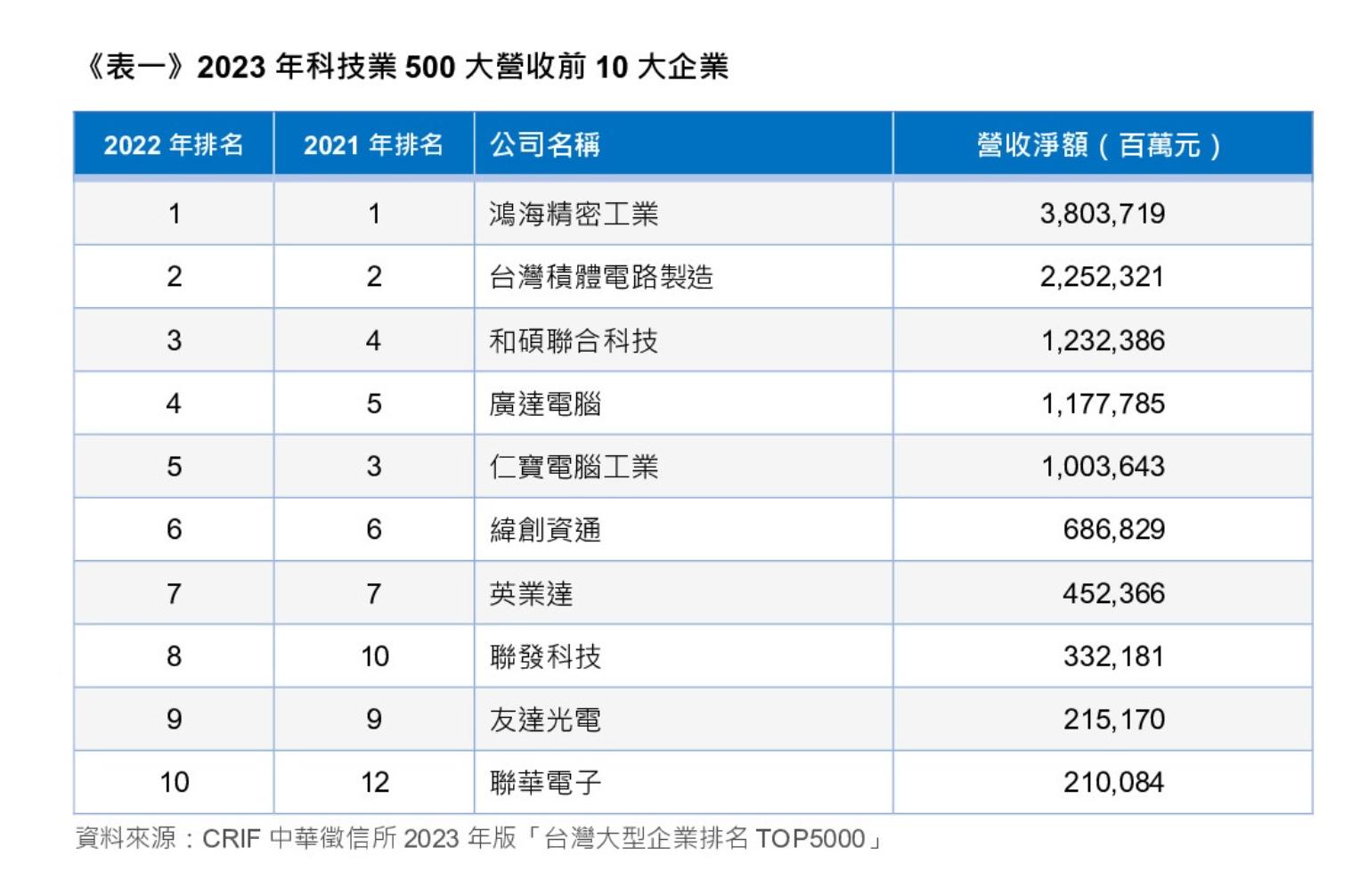 500大科技業營收前10大企業依次為鴻海精密工業、台灣積體電路製造、和碩聯合科技、廣達電腦、仁寶電腦工業、緯創資通、英業達、聯發科技、友達光電及聯華電子(詳參表一)。其中只有聯華電子是由2021年的第12名上升到第10名,其他9家企業中排名上升的則為和碩聯合科技及廣達電腦各由第4名及第5名上升到第3名及第4名,聯發科技由第10名上升到第8名。