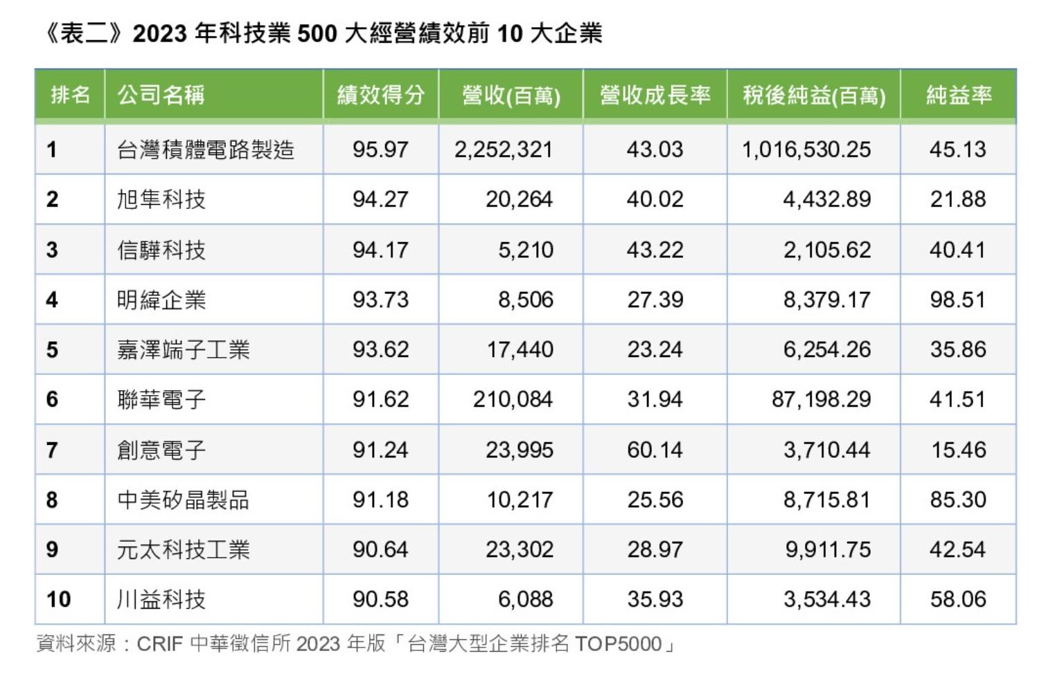 但根據500大科技業的企業經營績效綜合指標100大排名(詳參表二及註2)前10名來看,則呈現不同的面貌。其中台積電以經營績效得分95.97分高居經營績效榜首。旭隼科技以94.27分居於第2名。第3名至第10名依次為信驊科技、明緯企業、嘉澤端子工業、聯華電子、創意電子、中美矽晶、元太科技及川益科技。經營績效前10名的綜合績效得分都在90分以上。其中僅川益科技為川湖企業的子公司屬於非公發公司。