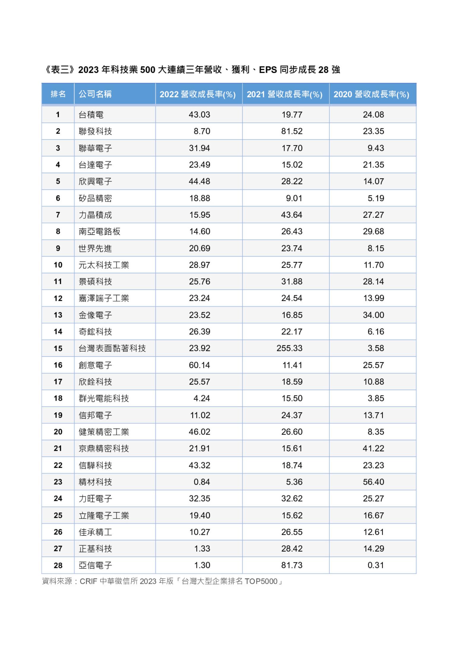 中華徵信所進一步分析發現在2022年科技業經營績效100大企業中,有28家企業為連續三年營收淨額、稅後純益及EPS(每股純益)同步成長的企業(詳參表三)。 中華徵信所指出,在過去三年新冠疫情中連續三年營收成長已經相當不容易,同時稅後純益能夠連續三年成長,則顯示這28家企業在同業中有很強的競爭力,再加EPS同步成長,則代表這28家公司伴隨的股利成長性也很強,堪稱是最強科技業。