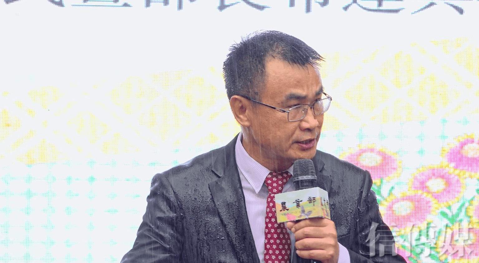 1日一早,因為卡努颱風下著大雨,從農委會主委升格成農業部部長的陳吉仲婉拒撐傘,淋著雨為農業部進行揭牌儀式。陳吉仲表示,近年台灣頻繁缺水,感謝老天滋潤大地,讓農業永續。