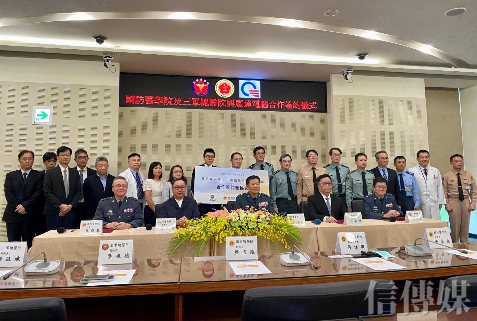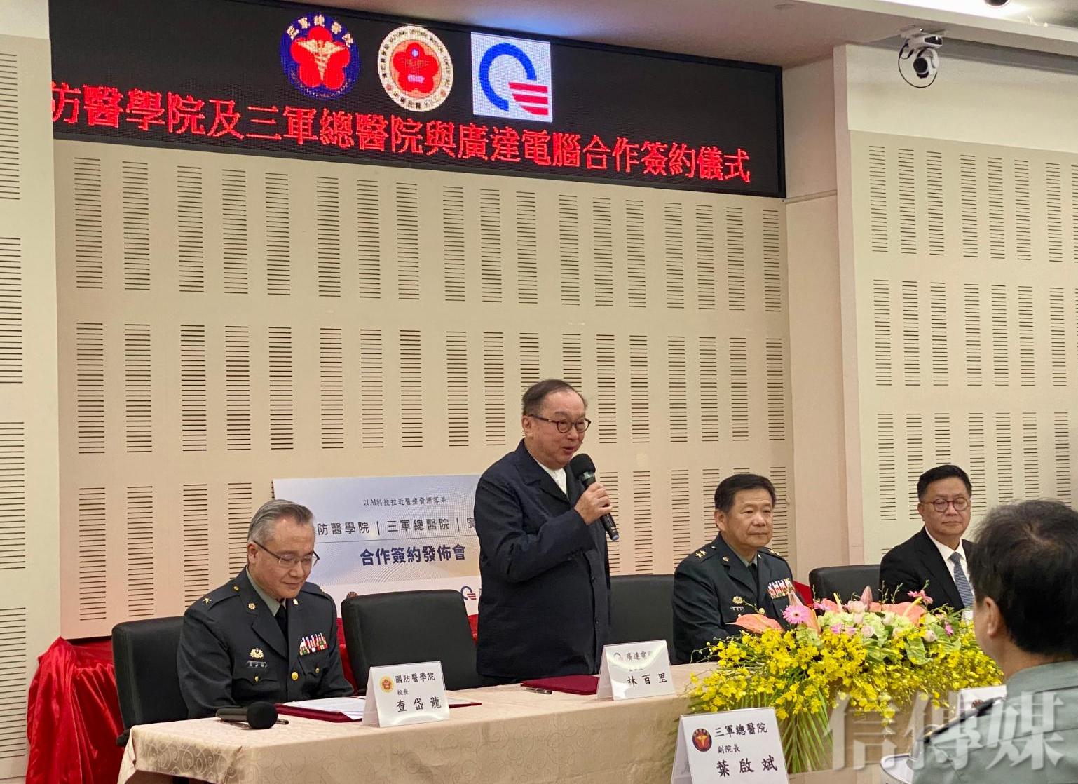 有「AI傳教士」之稱的廣達電腦董事長林百里也特別出席,與國防醫學院校長查岱龍、國防部軍醫局局長蔡建松、三軍總醫院院長洪乙仁共同簽署合作備忘錄。