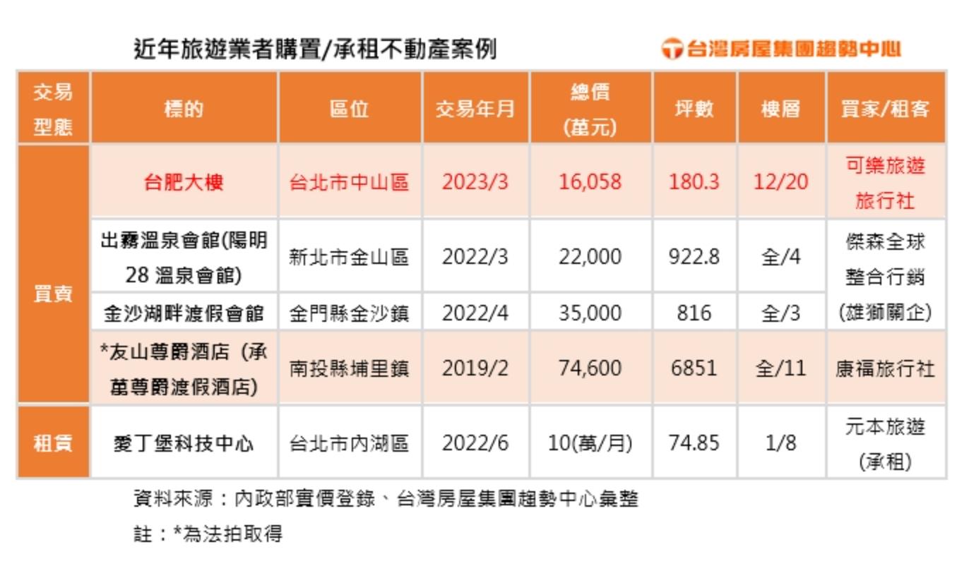 而在疫情之前,2019年2月,可樂旅遊旗下的康福旅行社就透過法拍方式,取得南投埔里「友山尊爵酒店」(現為:承萬尊爵渡假酒店),當時以約7.46億元現金買下。另外,還有旅行業者租賃店面的交易案例,新創辦的元本旅遊,在去年6月以每月10萬元租下內湖洲子街1樓店面。