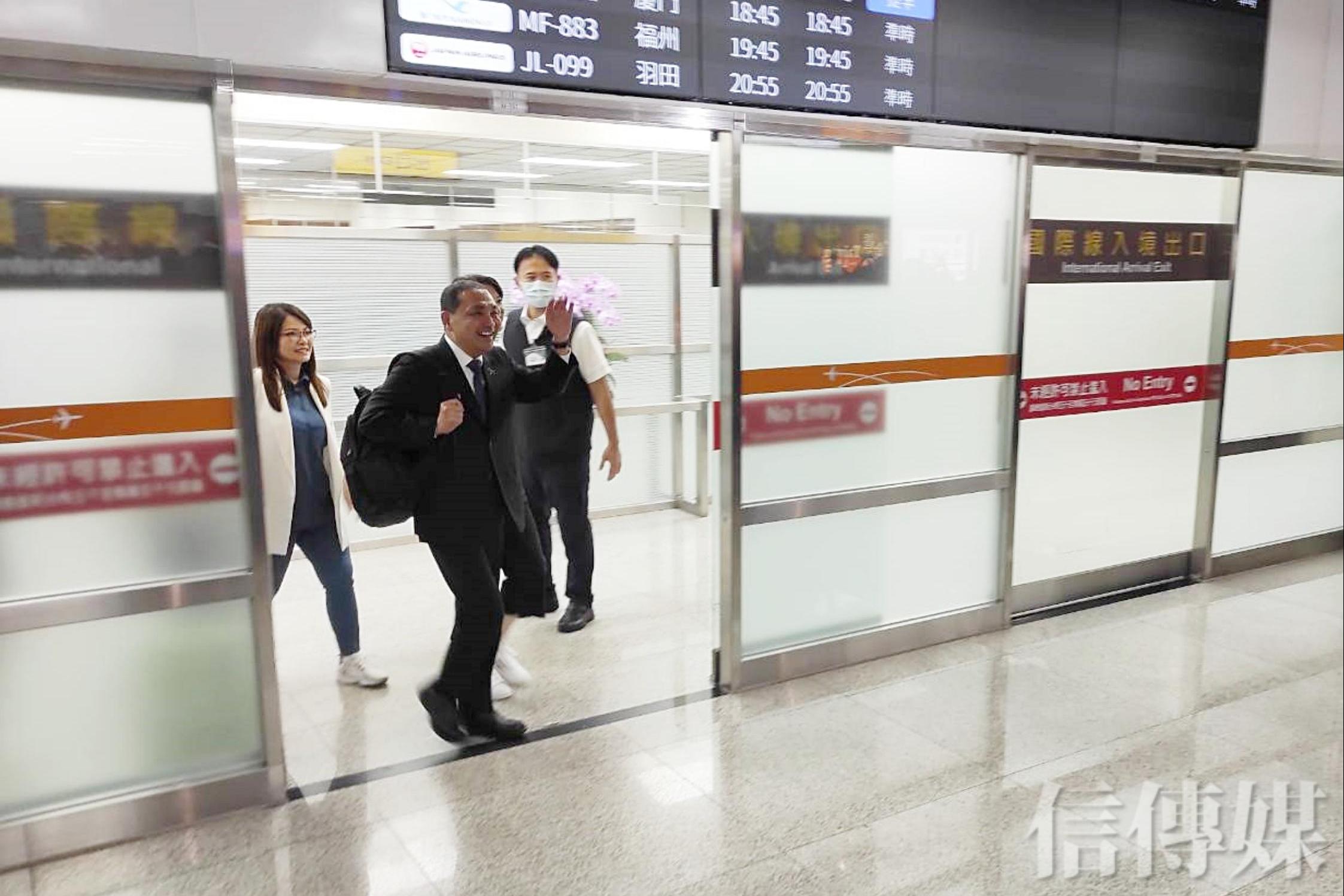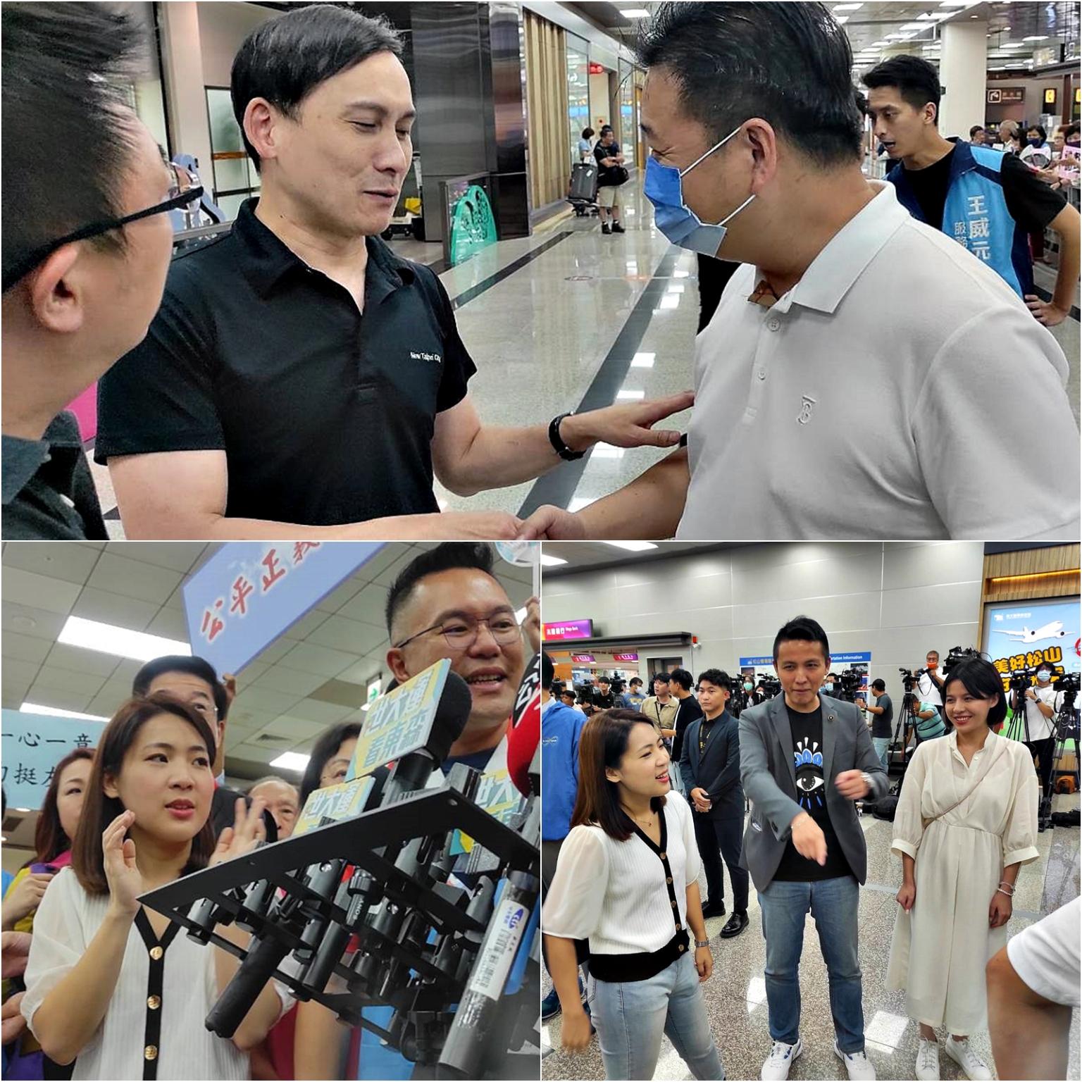 受到颱風影響,原訂16時55分出關,侯友宜實際約晚了20分鐘,但近百位黨籍民代及支持者不減熱情,老早就準備好國旗、鮮花、標語,一看到侯步出迎賓門,就高呼「侯友宜凍蒜」,聲浪此起彼落、不絕於耳。侯見狀顯得相當振奮,不只握拳振臂,也上前跟支持者們逐一握手致謝。