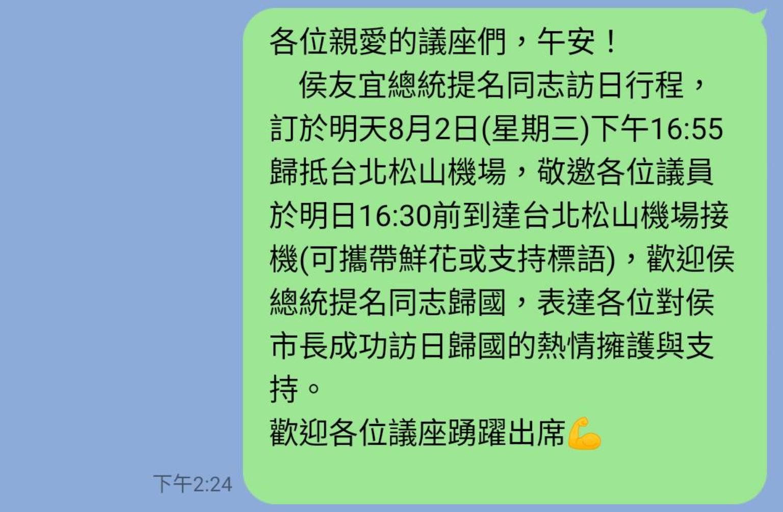 未料,卻遭到鴻海創辦人郭台銘訪美及彰化縣議長謝典林退黨影響,整個訪日議題全都失焦。為了再次提振聲勢、重新出發,趁著侯友宜今日返台,國民黨對雙北地區民代下達動員令,盼黨籍民代到場接機。