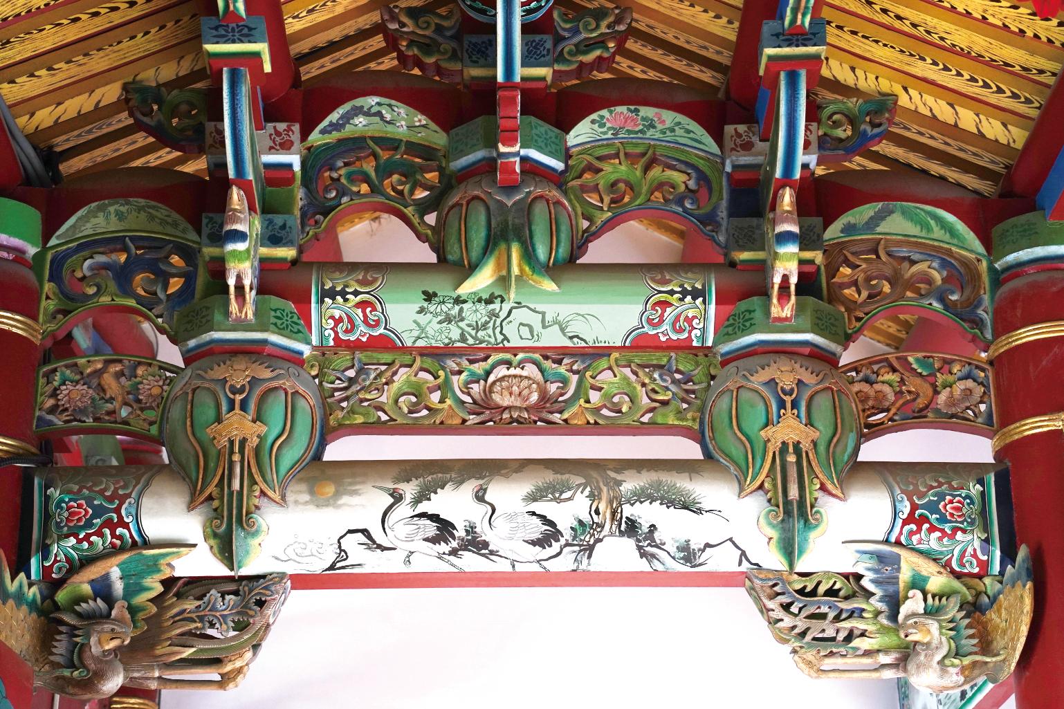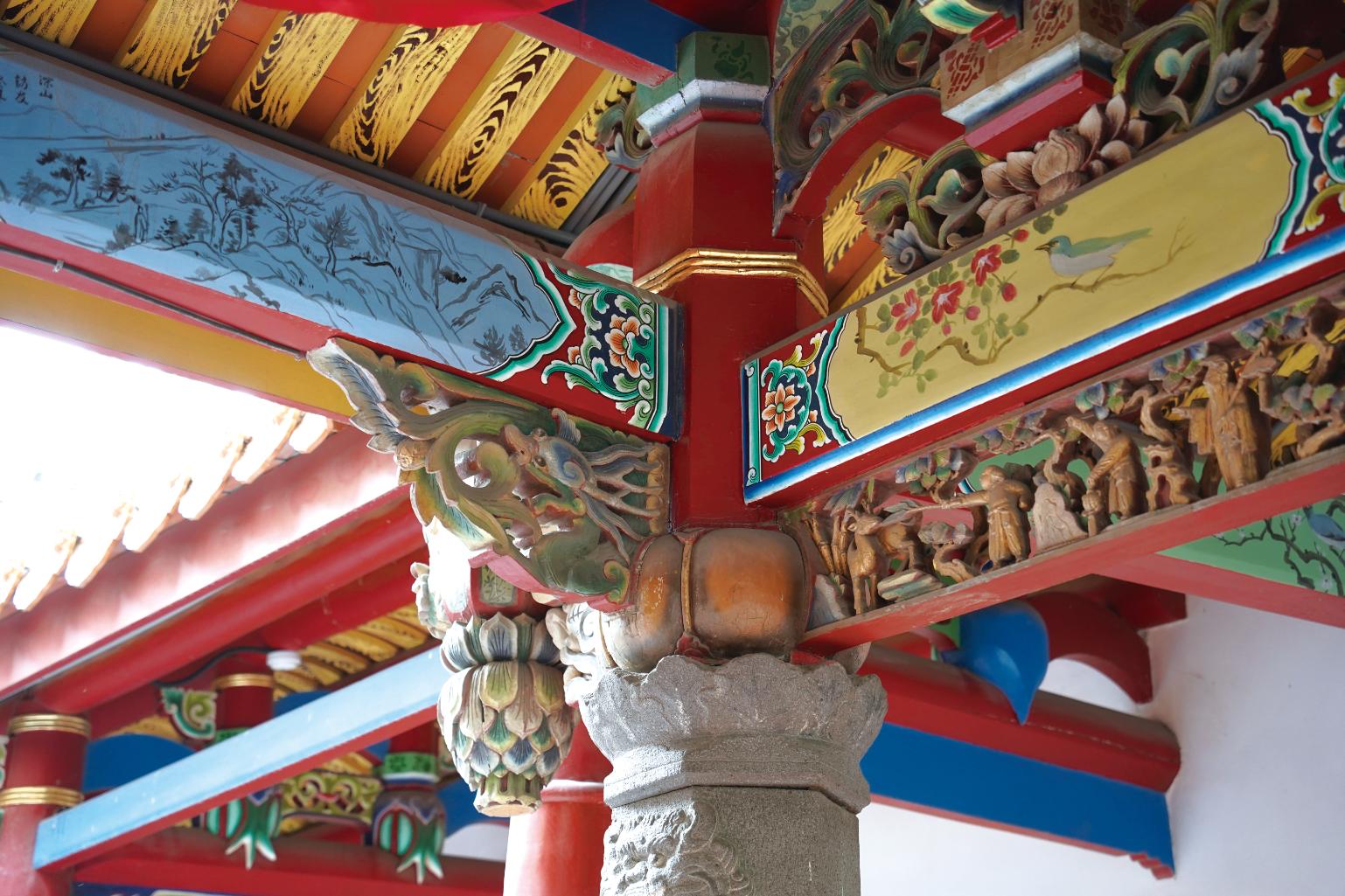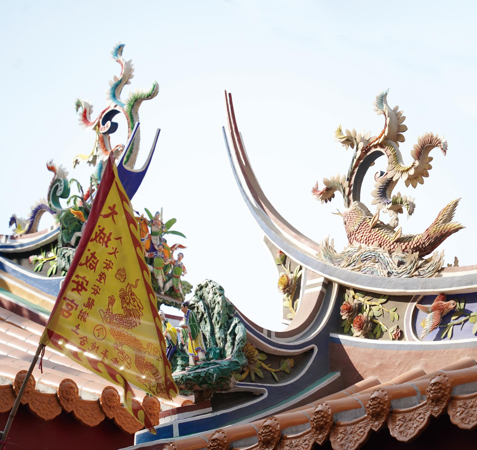 廟宇屋頂三川脊中脊上立有福祿壽三仙,左右為雙龍回首的剪黏;前簷廊左右各立一根龍柱,柱頭呈八角形狀,柱頂接蓮花形木構件,上承屋簷。拜殿與正殿屋頂形制為硬山燕尾式,正脊上飾以寶塔與雙龍剪黏,垂脊上有各式歷史及神話故事人物的剪黏。