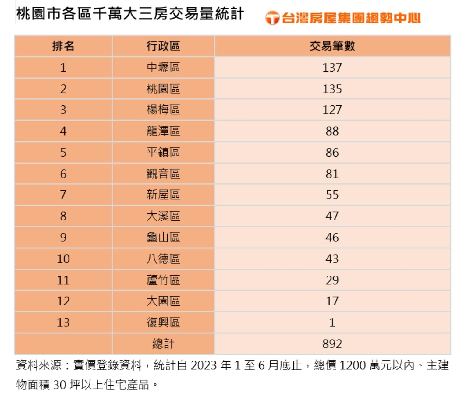 不過,對於首購族來說,購屋總價1200萬元預算,小資家庭怎麼買房最划算呢?根據實價登錄資料,統計今年以來,北台灣三都總價千萬元以內、主建物面積30坪以上,最適合家庭購屋者居住的交易,發現桃園市竟多達892筆稱霸北台灣,贏過新北市的191筆及台北市的19筆,其中前三名熱區,分別是第一名的中壢區137筆,以及桃園區的135筆,第三名則是楊梅區的127筆。