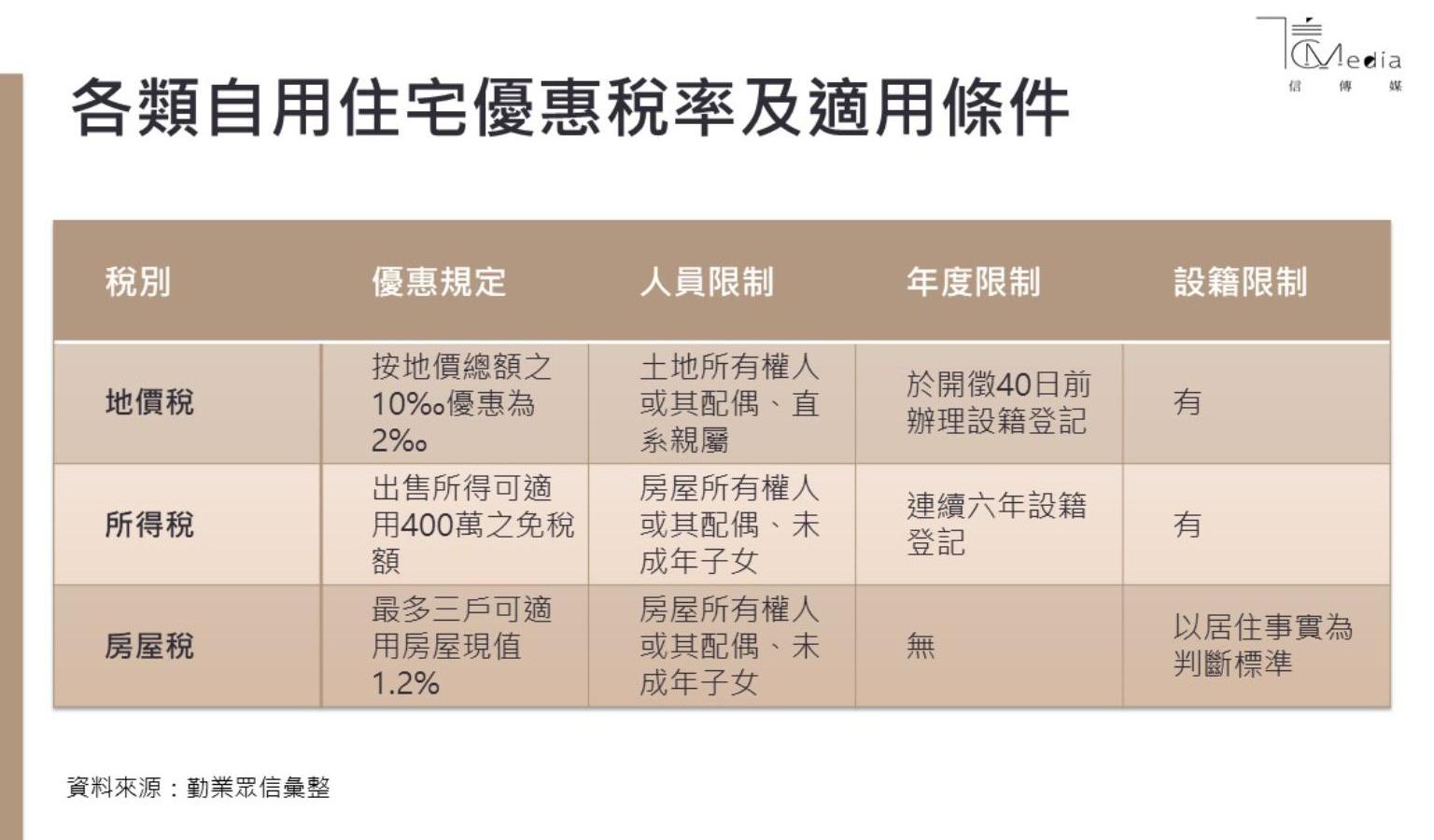 另須提醒留意關於土地交易中多有供自住使用的優惠稅率,但每一法令所規定的自住定義並不完全相同,除了皆須符合無出租營業使用的基本條件,例如地價稅為土地所有權人或其配偶、直系親屬於該地辦竣戶籍登記,但所得稅法規定出售自用房屋可享有400萬之免稅額,要求個人或其配偶、未成年子女辦竣戶籍登記、持有並居住於該房屋連續滿六年,條件限縮為無直系尊親屬及已成年直接卑親屬的適用,並且有戶籍登記的年度要求,而房屋稅則係規定本人、配偶或直系親屬實際居住使用,但不以房屋設籍為必要條件,各項稅目規範都有所不同,千萬別混淆搞錯享有優惠之法律要件。