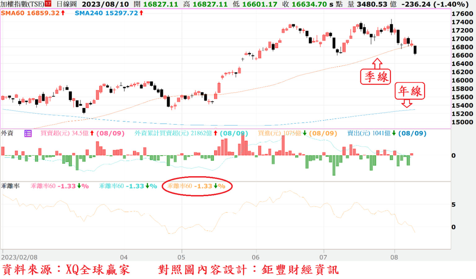8月截至10日,4日盤中最低點短暫跌破季線16,771點,指數雖隨即再度反彈上揚,但顯示多方氣勢在8月回檔轉弱,8月10日收盤正式跌破季線之下,季線乖離率雖已下降至負數,但從周K線觀察,年線乖離率仍在相對高檔區,不排除跌破季線後出現較大幅度回檔整理波段。