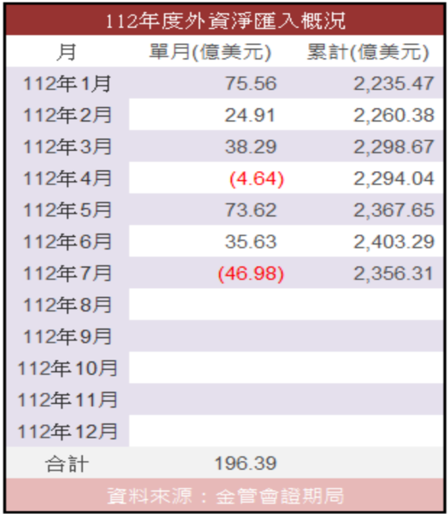 2023年7月外資單月淨匯出46.98億美元,折合台幣約1466億台幣,7月外資賣超台股上市公司839億,賣超上櫃公司102億,合計賣超941億,顯示7月外資除了賣超台股外,並將部分現金股利匯出,導致台幣匯率7月貶值0.92%,但台股在人工智慧(AI)概念股帶動下,在國內市場充沛游資追逐下,由仍逆勢上漲1.36%,顯示國內股市資金動能強勁,無懼出口持續衰退,7月外資匯出,多頭呈現高度韌性及攻堅企圖。