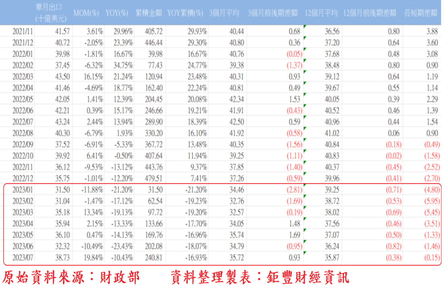 我國2023年7月出口金額387.3億美元,月增19.84%,單月創2022年10月後最高點,短期出口出現初步轉強徵兆,但仍年減10.43%,為連續11個月較去年同期負成長,顯示出口成長動能仍持續弱勢,但單月衰退幅度縮小,出現些微復甦曙光。累計2023年前7月出口2408.1億美元,年減16.93%,累積衰退幅度較前7月累計年減18.07%縮小。