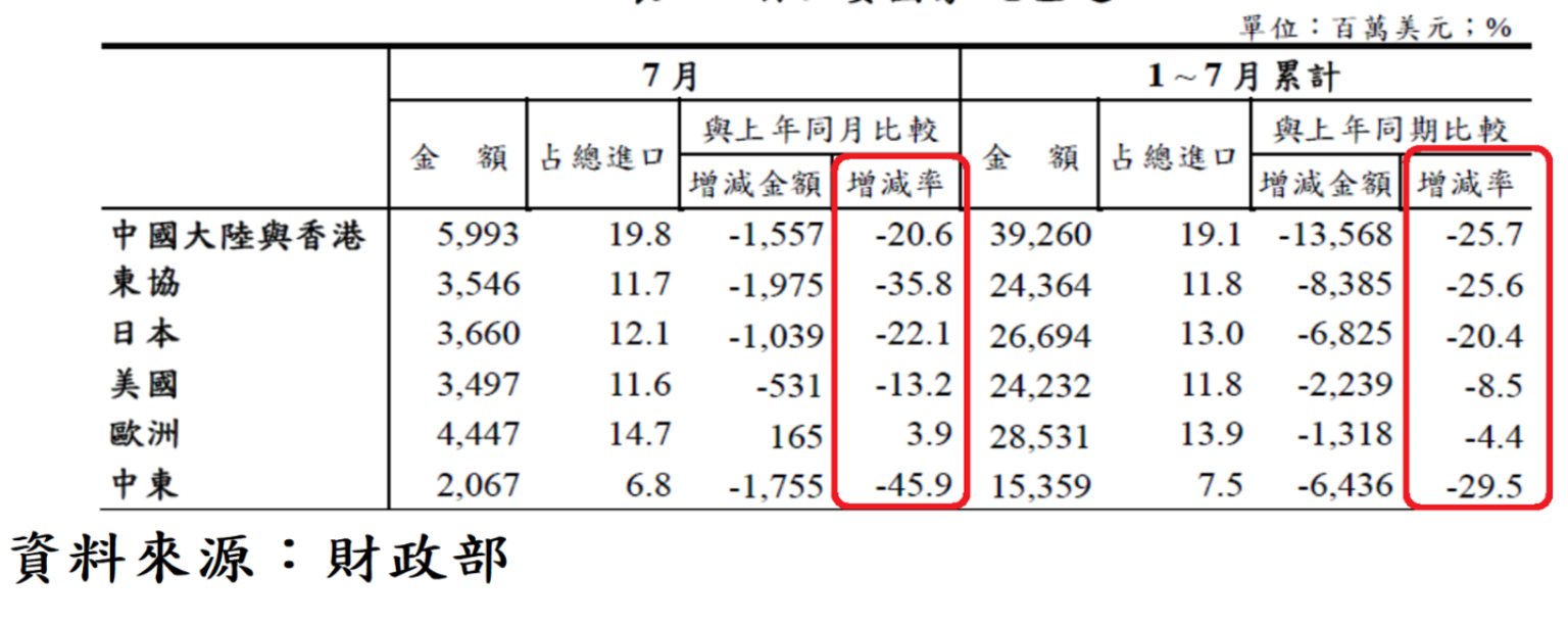 2023年7月對中國(含香港)出口年減16.3%,為出口衰退幅度最大的市場,前7月累計年減24.6%,對中國出口延續2022年的衰退窘況,且更加惡化;2022年整年對中國出口年減1.6%,亦為我國2022年唯一出口衰退市場,低於我國2022年整體出口年增7.41%。