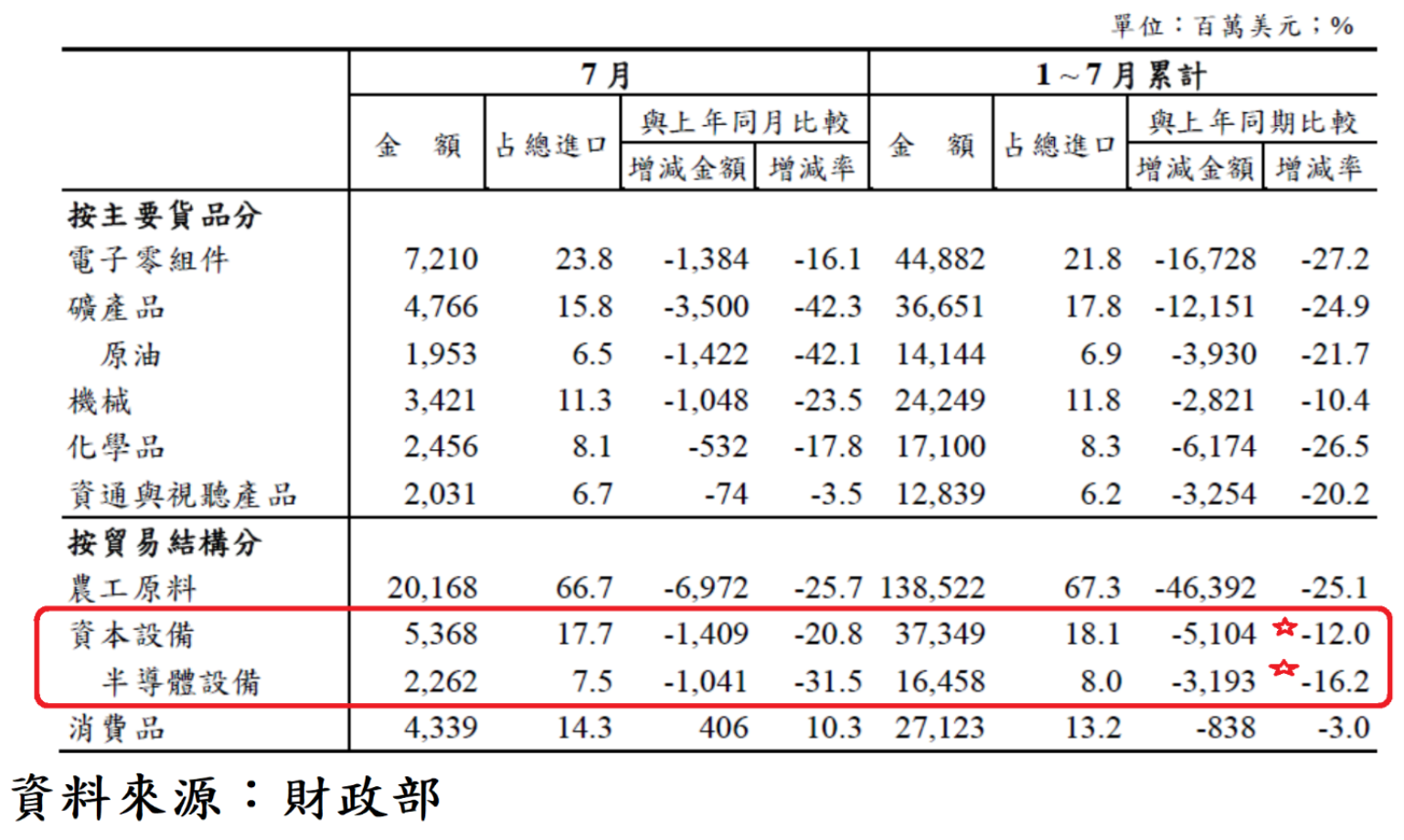 2023年7月資本設備進口年減20.8%,累計前7月資本設備進口年減12.0%;其中7月半導體設備進口年減31.5%,顯示近期半導體資本設備進口成長動能轉弱,累計前7月半導體設備進口年減16.2%,前7月半導體資本設備佔全部資本設備進口比率高達44.1%,顯示半導體產業仍是我國投資的最重要產業,亦為台灣出口未來再度恢復成長的火車頭產業。