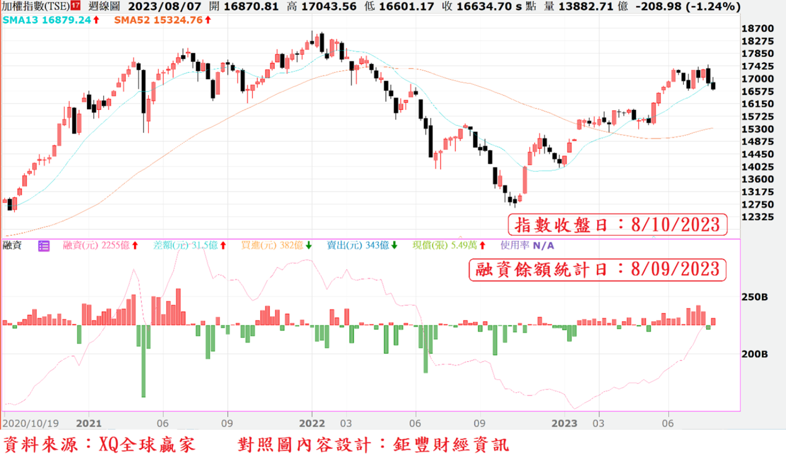 就台股周K線觀察,台股融資餘額元月中旬的波段低點為1,518億,至8月9日為2,255億,增幅約48.6%,同期間,台股指數從14,932點,上漲至16,870點,漲幅約為13.0%,明顯低於融資餘額的增幅。