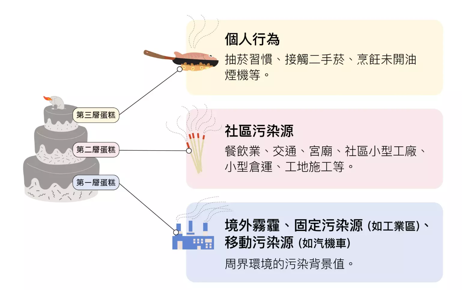如何評估 PM2.5 暴露風險?龍世俊說,PM2.5 暴露風險就像是三層蛋糕!境外霧霾加上本土工業區及移動污染源(如汽機車),會產生一個周界環境的污染背景值,這是「第一層蛋糕」;社區餐飲業、交通、宮廟、社區小型工廠、小型運輸業、工地等空污來源是「第二層蛋糕」;最後是個人行為,例如:抽菸習慣、接觸二手菸、烹飪未開抽油煙機等,為「第三層蛋糕」;三層蛋糕累加起來就是實際的暴險濃度。