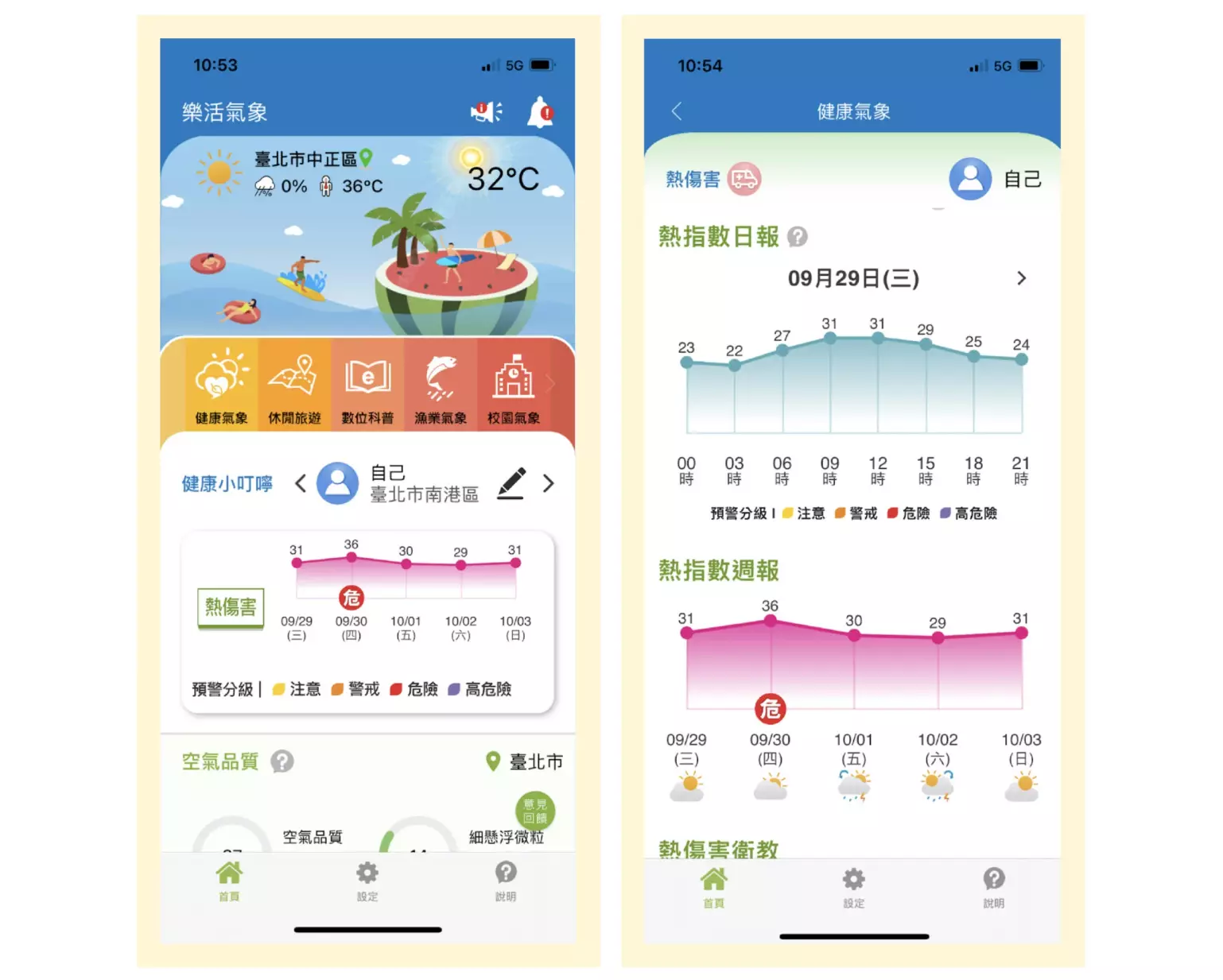 「健康氣象」不但可以做到鄉鎮預報,讓達到預警等級地區之民眾、易受熱危害的族群多加注意,國健署也發揮強項,在平臺中提供熱危害衛教的各項因應措施。透過 App 還能直接搜尋鄰近的急救醫療院所。