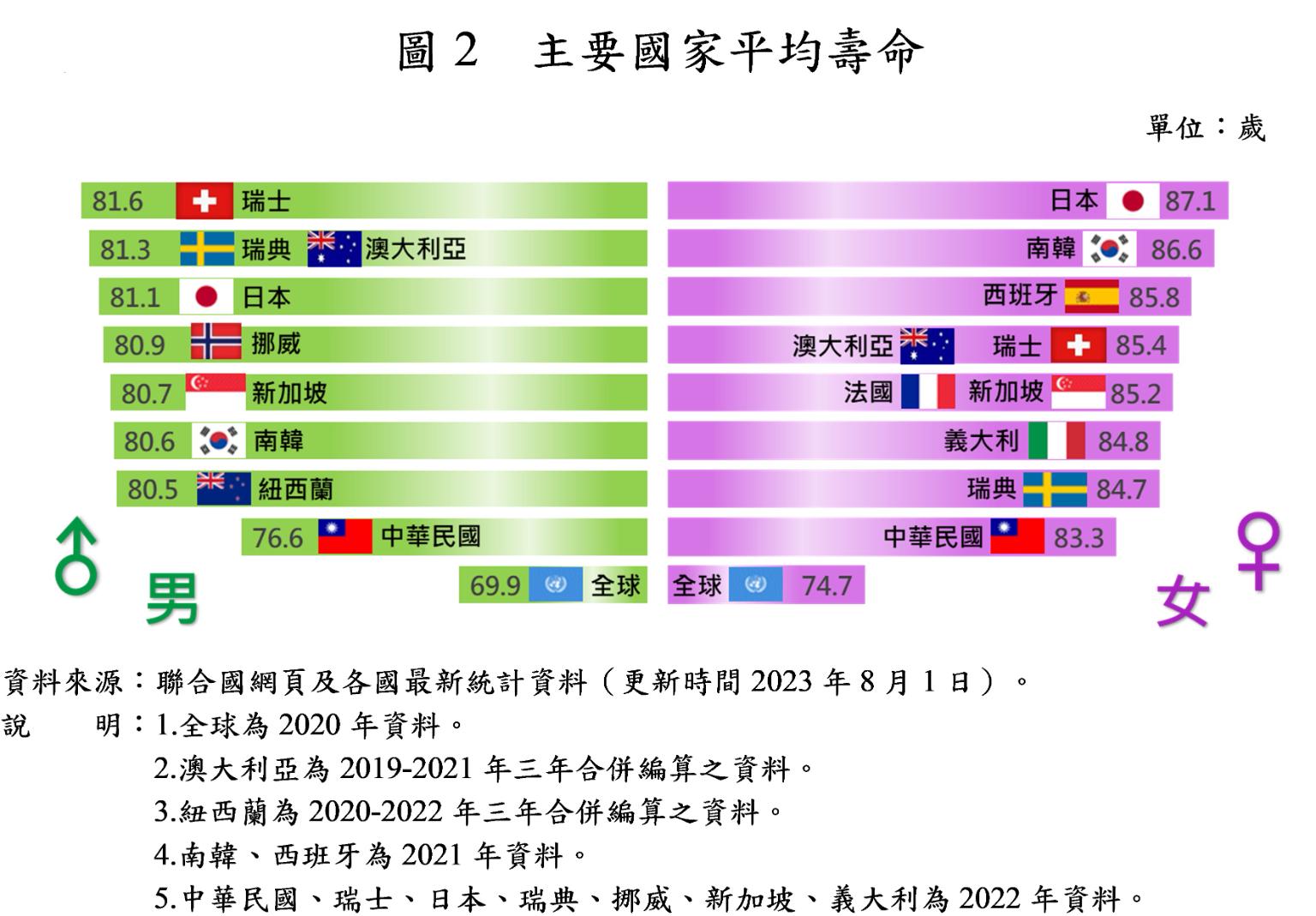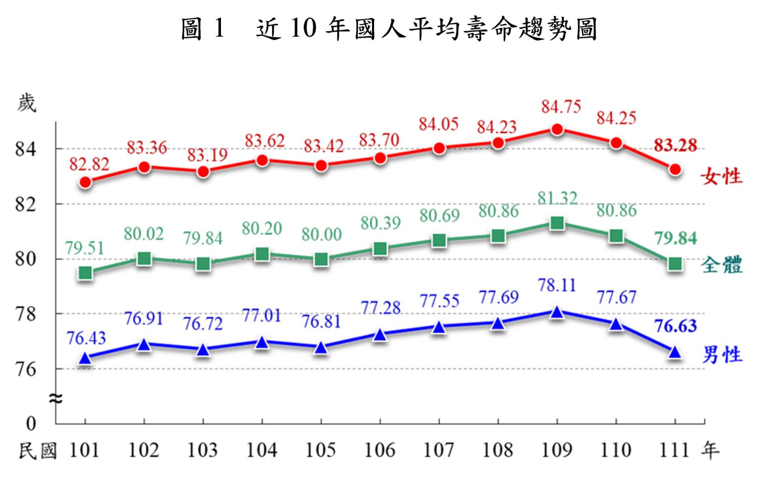 內政部今(11)日公布「111年簡易生命表」,國人的平均壽命為79.84歲,其中男性76.63歲、女性83.28歲。另外,與聯合國公布2020年全球平均壽命比較,我國男、女性平均壽命分別高於全球平均水準6.7歲及8.6歲。