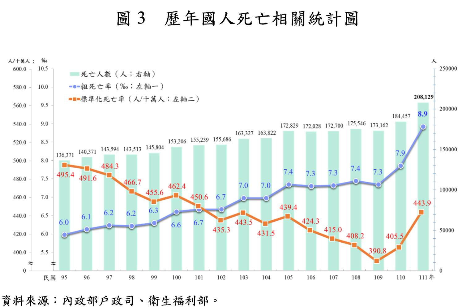 內政部指出,受COVID-19疫情及人口老化影響,111年國人死亡人數為20萬8,129人,較110年增加2萬3,672人,其中65歲以上死亡人數15萬8,737人(占全國76.27%),較110年增加2萬1,483人。另外,111年粗死亡率為8.92‰,較110年增加1.06個千分點;標準化死亡率為每十萬人口443.9人,較上年上升9.5%。