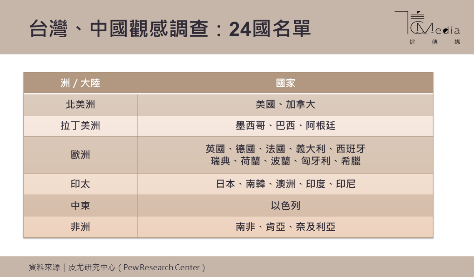 當被問及對台灣的看法,24國平均下來每四名受訪者就有一人選擇「不知道」,而這個比例中國只有5%。