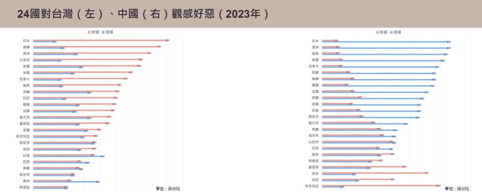 美國智庫「皮尤研究中心」(Pew Research Center)調查了24個中高收入國家對台灣的評價,發現平均而言好感(48%)大於惡感(28%),相形之下,各國對中國的好感(28%)則顯著低於惡感(67%)。