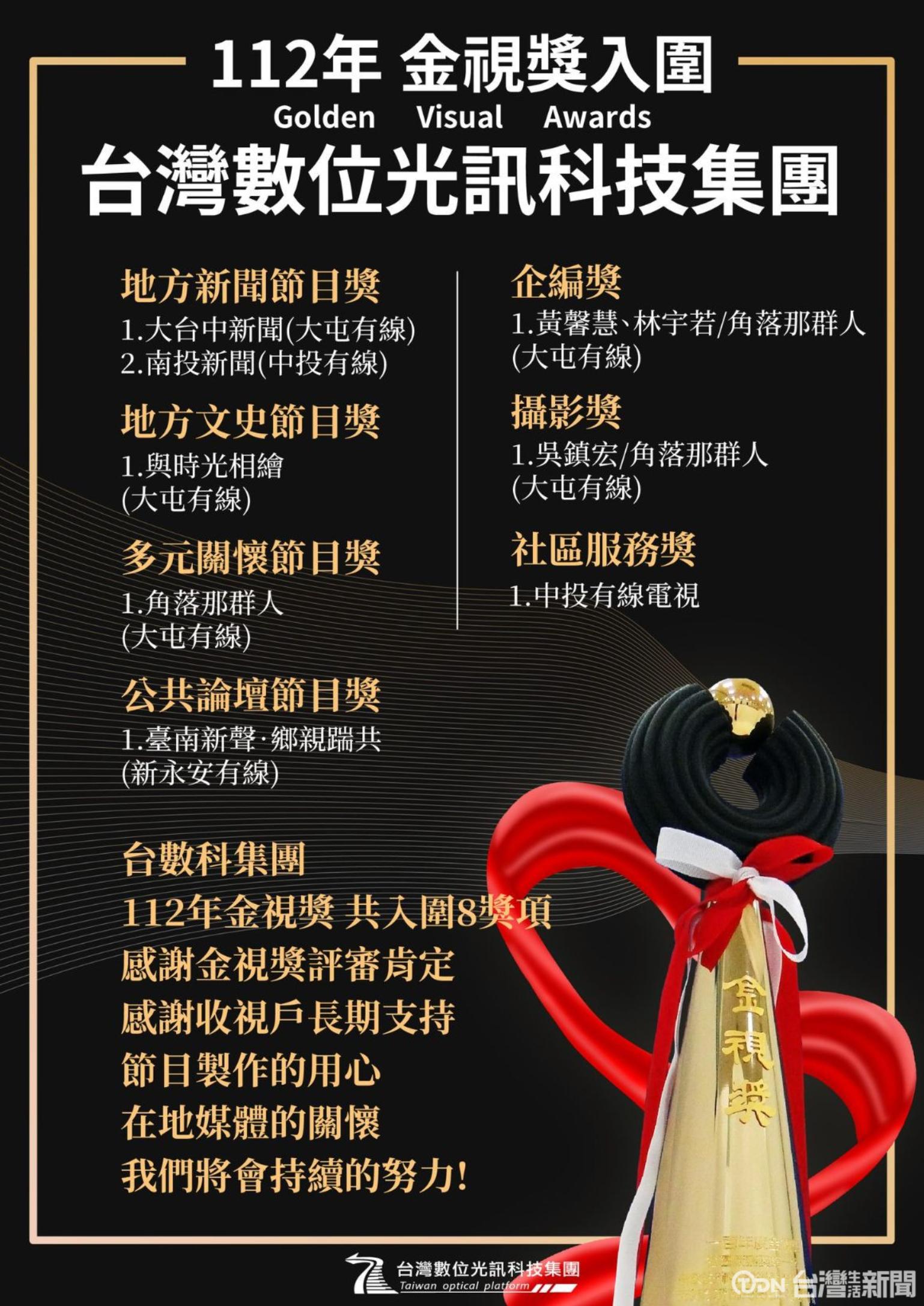 第二十三屆金視獎頒獎典禮,於今(14)日下午在台北進行頒獎,深耕中部多年的台數科集團,旗下的有線電視,這次也入圍8項大獎,在節目類入圍 5件、個人類入圍 2件及入圍社區服務獎,最終兩項入圍作品獲獎,分別是「與時光相繪」奪下地方文史節目獎,「角落那群人」則奪下多元關懷節目獎,台數科深耕地方基層實力有目共賭,期盼未來持續打造優質節目,關懷在地、為地方發聲。
