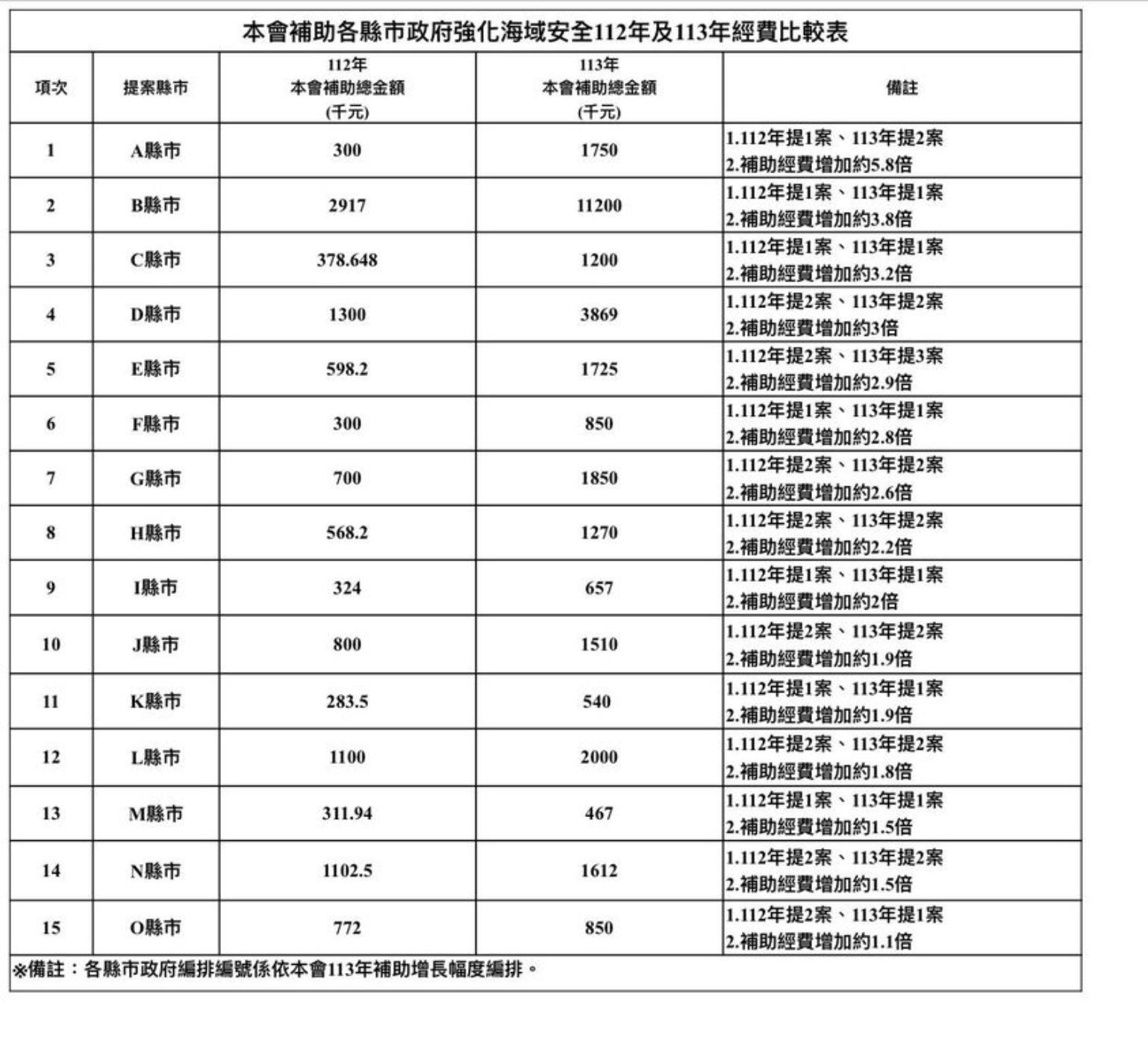 管碧玲說明,經向行政院爭取後,初步核定,自113年起將補助地方政府總金額倍增,由1,050萬元提高為2,050萬元,提升補助地方政府海域遊憩活動安全工作,包含完善海域遊憩活動場地、辦理水域遊憩安全宣導、辦理區域救生救難演練及補強地方救生救難人員及裝備等四大面向,各縣市政府受補助金額都有明顯增,最高達4.8倍,其中以基隆市為例,獲補助經費為今年的4倍。