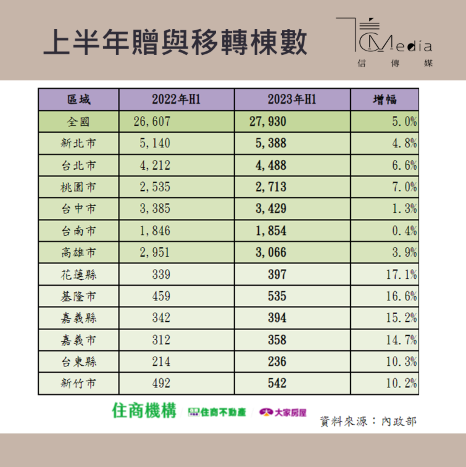 綜觀全國及各縣市今年上半年度贈與移轉,量體大戶還是六都,各都上半年都破千棟,新北市共計5,388棟數量最多,六都中年成長最高為桃園市,年增7.0%,六都以外上半年的贈與移轉成長更顯著,有六個縣市年增幅超過10%,依序為花蓮縣年增17.1%、基隆市16.6%、嘉義縣15.2%、嘉義市14.7%、台東縣10.3%、新竹市10.2%,贈與熱潮漫延到六都以外區域。