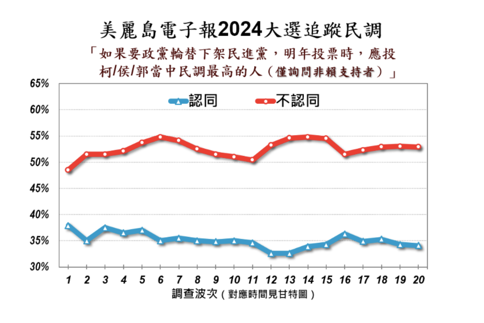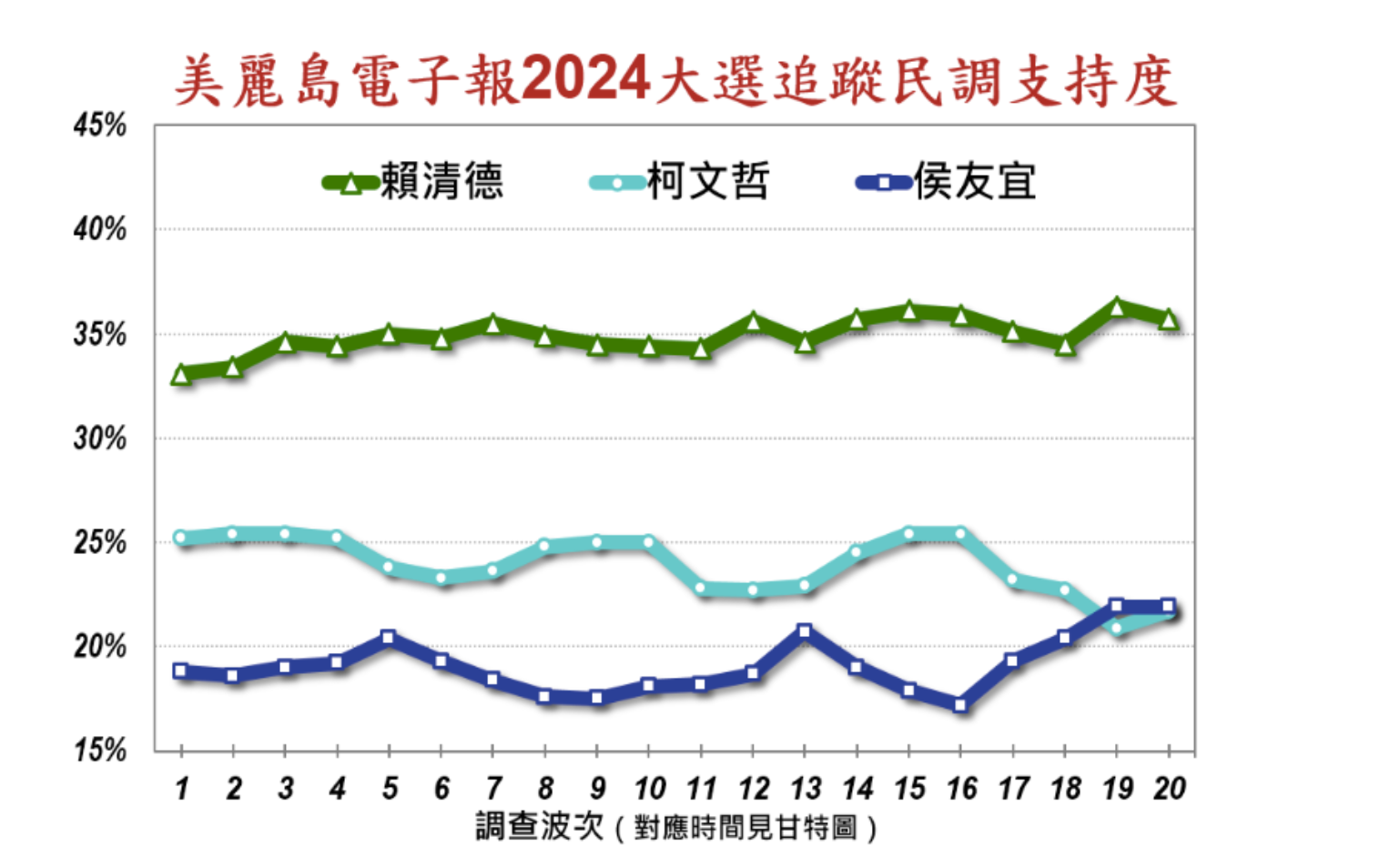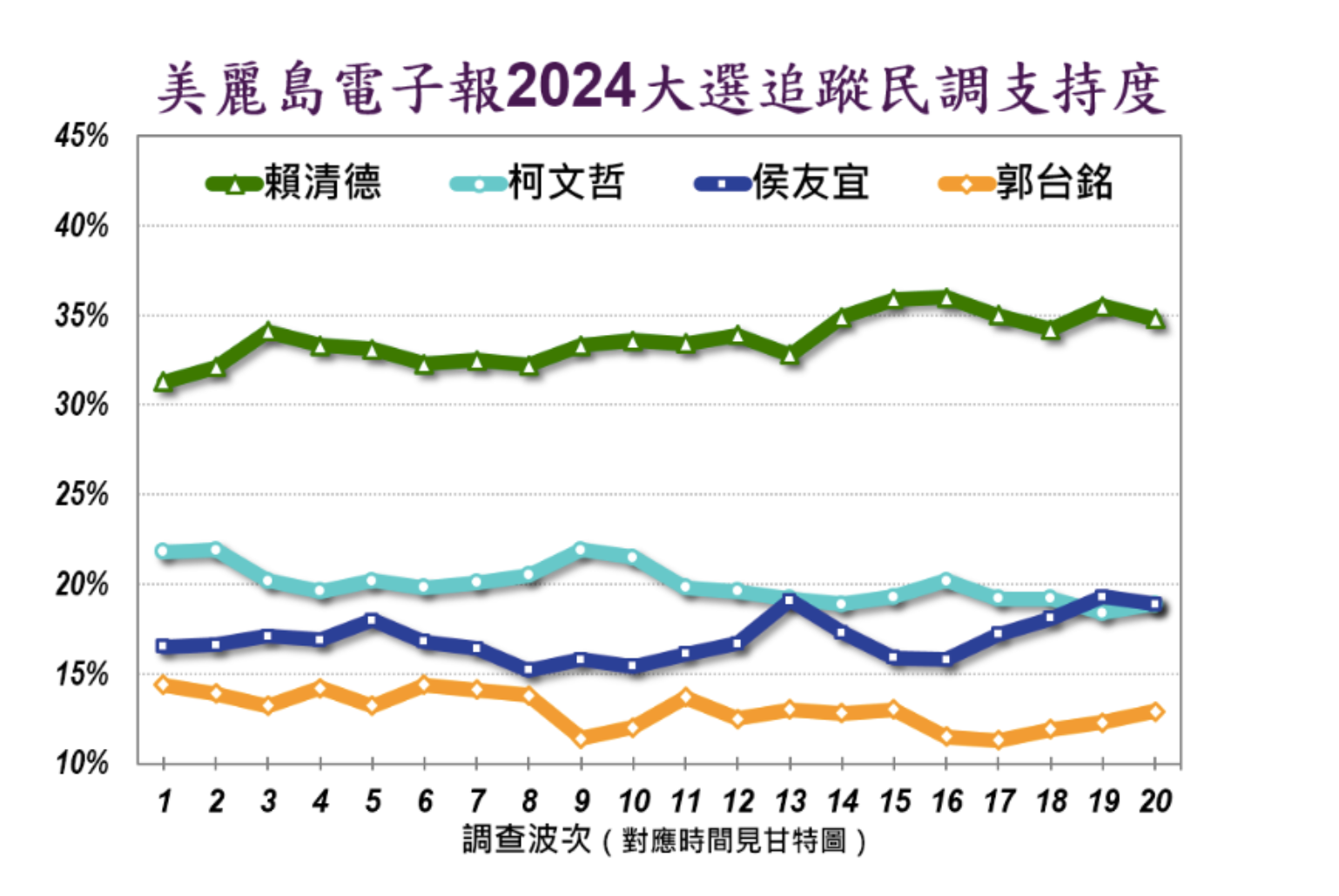 2024總統大選火熱開打,根據《美麗島電子報》最新民調,在三腳督情況下,民進黨總統參選人賴清德35.7%、國民黨總統參選人侯友宜21.9%、民眾黨總統參選人柯文哲21.7%墊底。至於在四腳督戰局,賴清德34.8%、侯友宜18.9%、柯文哲18.9、鴻海創辦人郭台銘12.9%墊底。由於這份民調進行時間剛好與新竹市長高虹安遭起訴時間重疊,是不是高案拖累柯文哲選情,後續有待觀察。