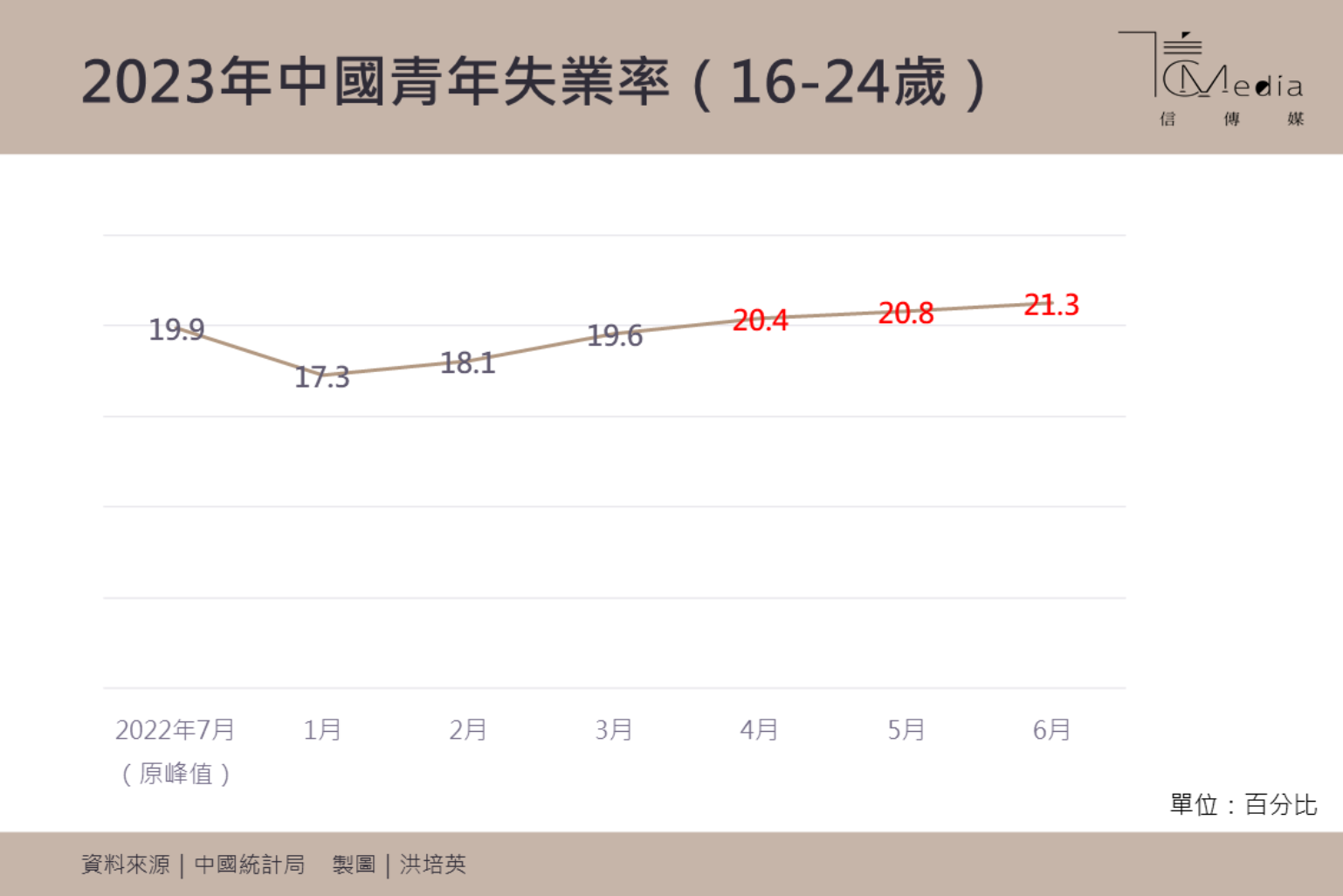 中國面臨通貨緊縮前景,不僅疫後經濟復甦速度不如預期,4月以來青年失業率(16-24歲)也屢創有紀錄以來的新高,6月高達21.3%,即每4人就有1人沒有工作。北京大學副教授張丹丹甚至表示,實際數據可能上看46.5%。