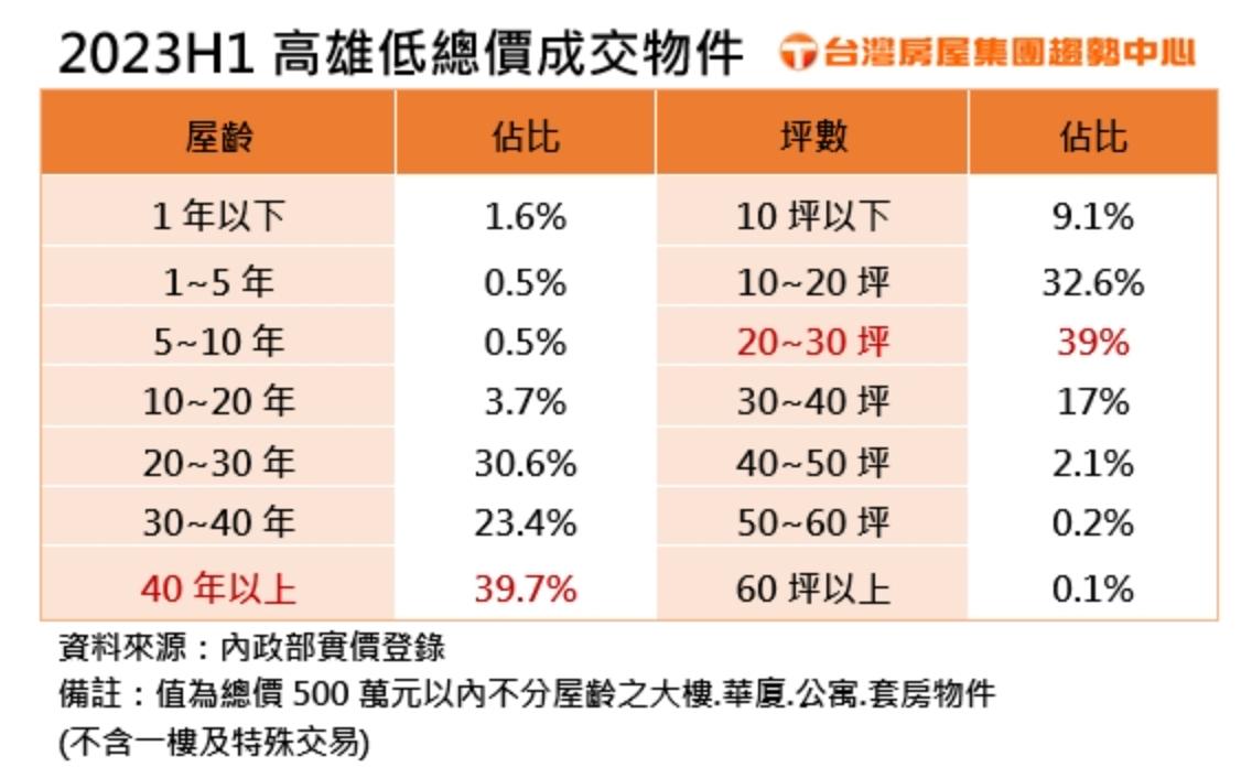 李家妮認為,近年高雄房價水位升高,中古房價連帶補漲,低總價交易比例有逐漸下滑的趨勢,未來想要鎖定市區以親民價購屋,在購屋條件上,勢必有所取捨,走向捨新求舊、棄大換小的選擇,而不少物件雖屋齡偏高,不過如位在優勢地段仍具有保值空間。不過,老屋修繕、翻新成本,相對新屋耗費高,都可能增加實際購屋成本,購屋族也需列入考量。