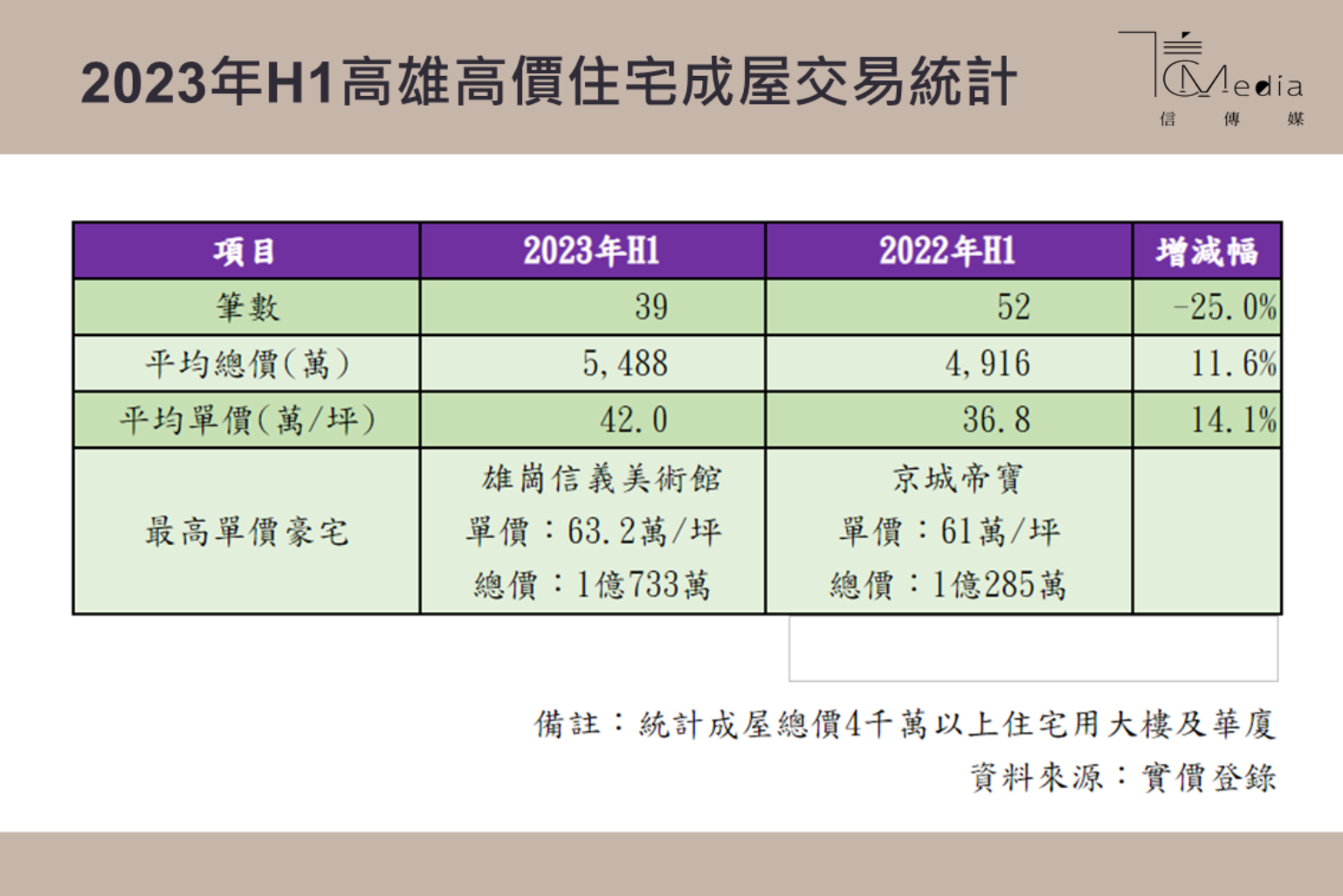 今年上半年高雄市高價住宅交易量如預期下滑,但價格不受衝擊,依然穩定上揚,依據實價成屋資料,高雄市總價4千萬以上的大樓、華廈住宅交易量雖比去年同期少25.0%,但平均總價5,488萬元比去年同期增加11.6%,平均單價42.0萬元,也比去年同期高14.1%。