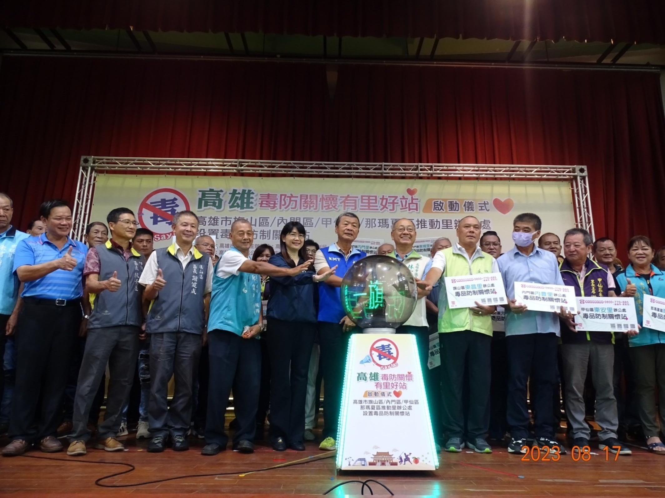 高雄市政府毒品防制局持續推動首創「里辦毒品防制關懷站」,前進旗山、內門、甲仙、那瑪夏四區,今(17)日於旗山的鼓山國小舉辦 4 區 49 里辦公處毒品防制關懷站成立啟動儀式,由區長及旗山區邱清郎里長主席、內門區龔飛盛里長主席、甲仙區游新儀里長主席、那瑪夏區劉陳玉梅里長主席率領的49 位里長、鄰長、志工隊、巡守隊等逾 600位里民熱情相挺,林義迪議員、林富寶議員、邱議瑩立委代表、朱信強議員代表、警察局旗山分局長、六龜分局長、鼓山國小陳校長、圓富國中達芙妮.伊斯坦大校長、戶所主任均到場支持響應,大家戴上毒防局特製反毒雄讚安全帽, 齊力宣誓反毒。