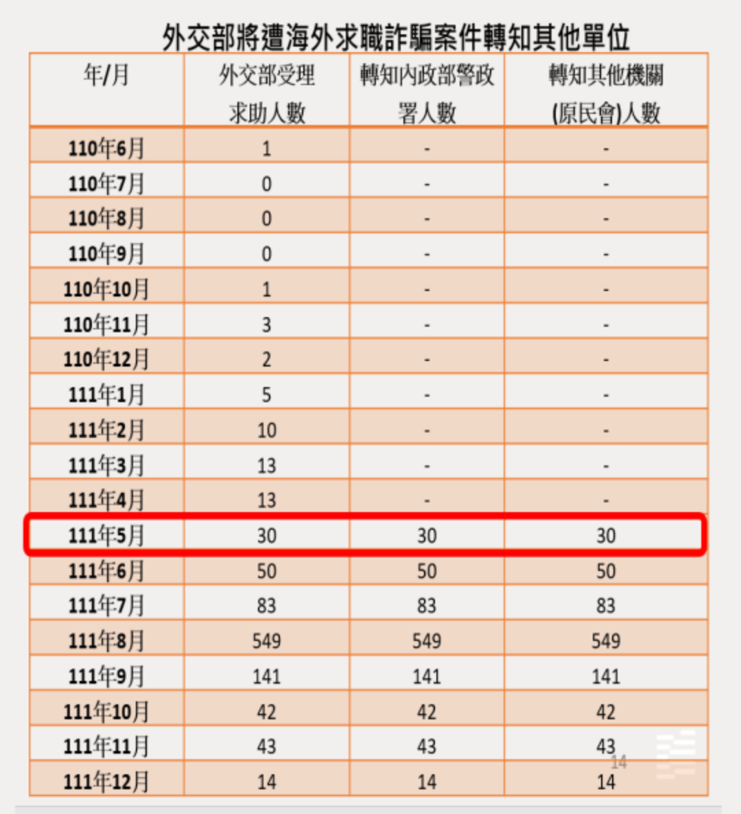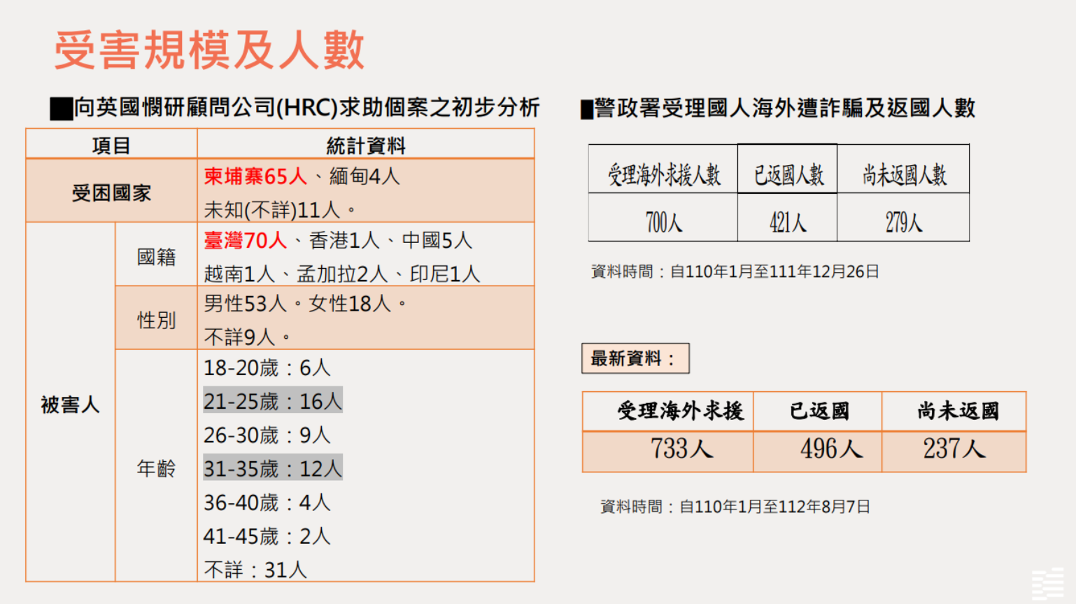 據外交部緊急聯絡中心自110年至112年6月接獲民眾遭誘騙至國外工作之求助案計643件;向我國駐外館處求助人數:柬埔寨計682件、泰國194件、緬甸124件。據刑事警察局統計,自110年1月至112年8月7日受理報案733件、已返國人數496人、尚未返國人數237人。