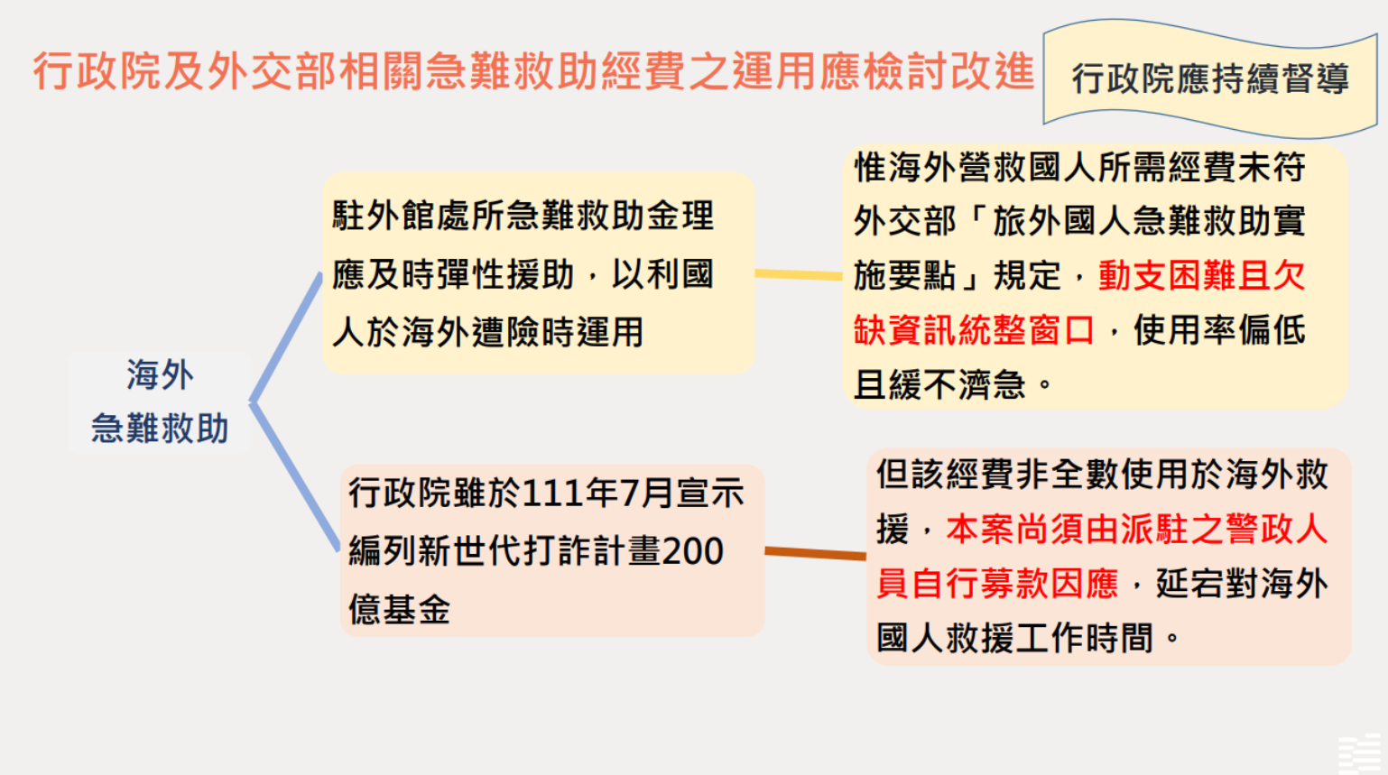 另外,外館在救援過程中,包含人力等都極需經費協助,駐外館處所提供之急難救助金理應及時援助,然而海外營救國人所需經費未符外交部「旅外國人急難救助實施要點」規定,無法提供代墊或代繳醫療、住宿、罰金、保釋金等款項服務,只有必要時才可借支。