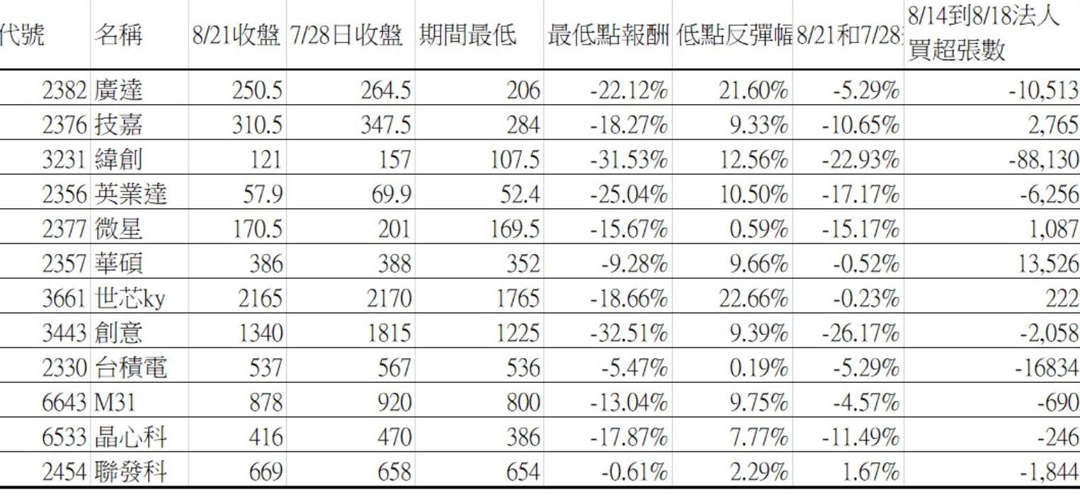 另一方面,AI概念股自7月28日之後大幅度的下修,經過在底部一番震盪,有些個股反彈甚多,這波反彈被法人視為「AI個股」篩選器,以廣達為例,7月28日收盤在264.5元,一度重跌到206元,報酬率-22.12,若以今天(21日)收盤計算,和264.5元相比跌幅收斂到5.29%,在AI概念股表現相對優異。