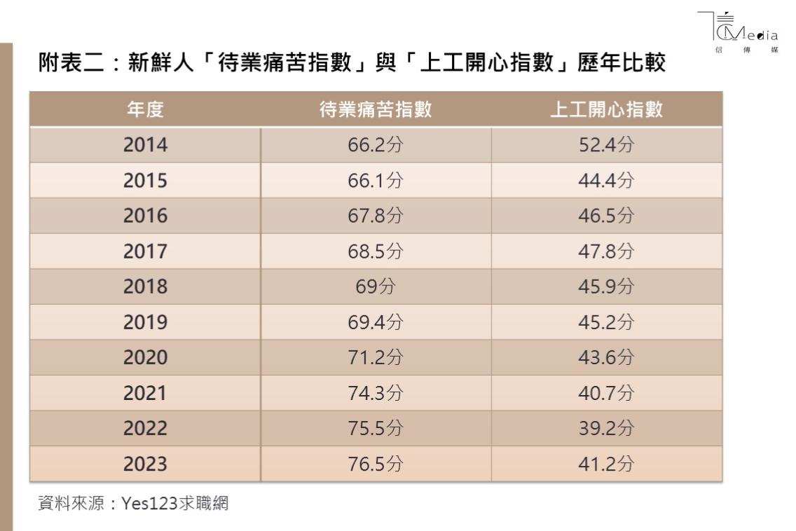 衡量待業期間的精神壓力與經濟壓力,「九年級生」新鮮人自評的「待業痛苦指數」,平均落在76.5分,高於去年的75.5分,創下十年以來新高,其中自認達到「滿分(一百分)」的,更佔了一成八(17.9%):這些人恐怕已達到「痛不欲生」、「苦不堪言」的程度。