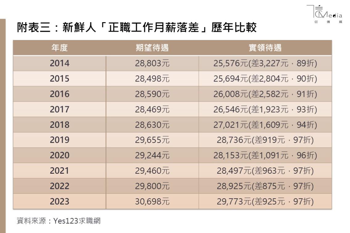 總的來說,今年新鮮人期望與實領的月薪,兩者中間落差有925元,略多於去年的875元差距,大約是打了「九七折」。