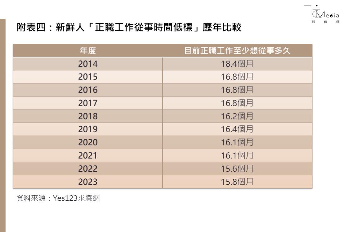 因此平均下來,今年的新鮮人對於一份工作,至少想做15.8個月,大約為474天,略多於去年的15.6個月:等於先累積「五個季度」左右的工作經歷再說。