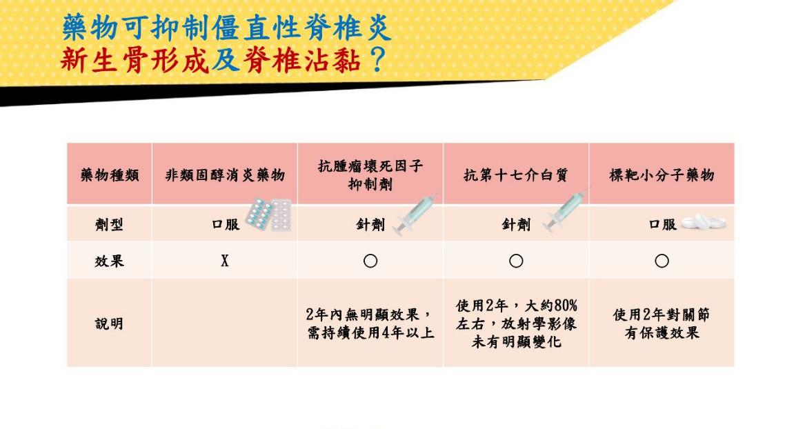 周昌德提到,僵直性脊椎炎雖無法根治,但健保已給付多種藥物,包括疾病調節抗風濕藥物、非類固醇消炎藥、生物製劑與今年4月健保首度給付的口服標靶小分子藥物,都有助病友達到「止痛降發炎、保持脊椎活動範圍及功能、預防併發症發生」的3大目標。他也強調,「除了藥物治療,不要抽菸、養成游泳、有氧運動等運動習慣,也有助於控制病情。」