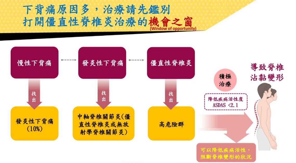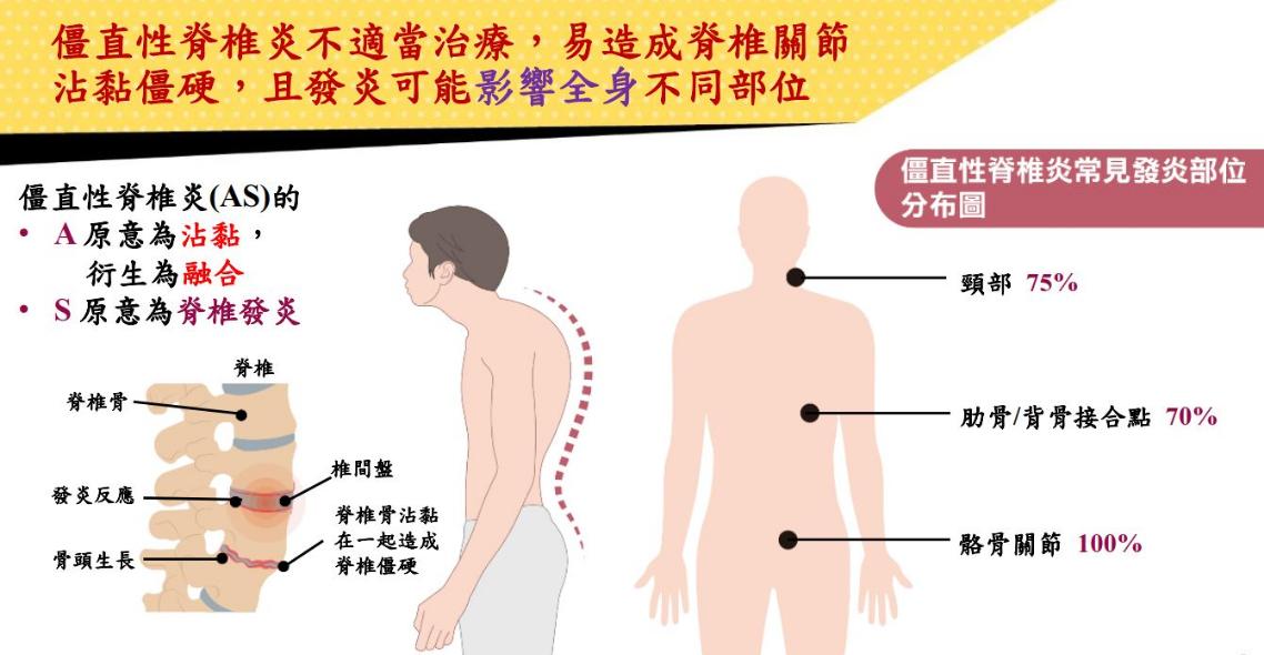 「至今仍有不少僵直性脊椎炎患者拖了1年以上才正確診斷,不僅因疼痛翻來覆去睡不好,還可能引發脊椎僵硬、沾黏而駝背、造成其他併發症,應及早治療。」風濕病基金會台灣抗風濕病聯盟執行長、輔仁大學附設醫院風濕免疫科主任蔡長祐指出。