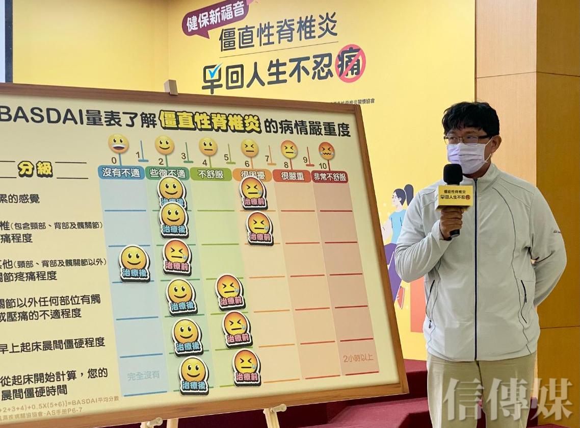 台北榮總過敏免疫風濕科教授級主治醫師、僵直性脊椎炎權威周昌德表示,「僵直性脊椎炎延誤治療或長期控制不佳,容易造成疼痛與脊椎僵硬,並導致脊椎沾黏,影響身體姿勢、睡眠與生活品質,產生虹彩炎、乾癬、骨質疏鬆、心血管疾病、發炎性腸道疾病等共病的風險也比一般人更高。」