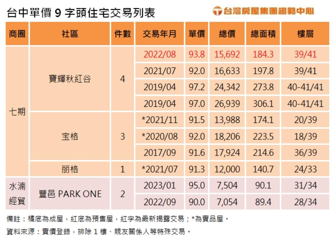 台灣房屋進一步彙整實價登錄以來,台中單價9字頭的住宅交易,截至目前為止,包括成屋及預售屋,台中已有10筆交易揭露,其中最高單價就是「寶輝秋紅谷」最高層樓中樓的97.2萬元,且該社區在9字頭俱樂部中獨佔4席,也是全台中最多!七期夏綠地公園第一排的「宝格」,亦有3筆交易進榜;水湳經貿園區的預售案「豐邑PARK ONE」,則有2筆交易站上9字頭;與「宝格」同樣由大陸建設出品的「丽格」,也以24樓實品屋的91.3萬元躋身榜單。