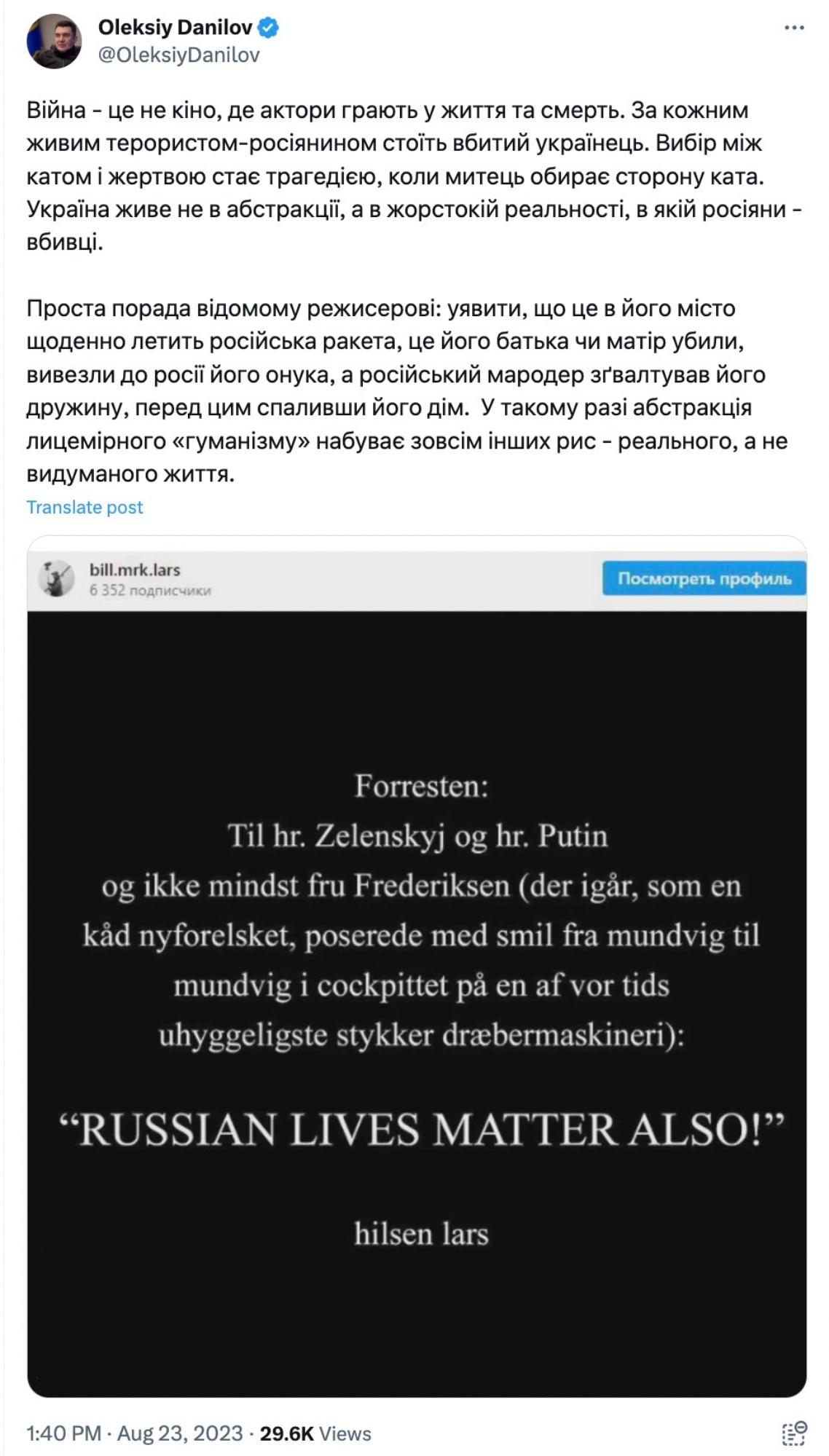 達尼洛夫寫道:「烏克蘭並不像電影中那樣生活在『抽象』中,而是生活在俄羅斯發動戰爭的『殘酷現實』裡。 每一個活著的俄羅斯恐怖分子背後都有一個死去的烏克蘭人。」